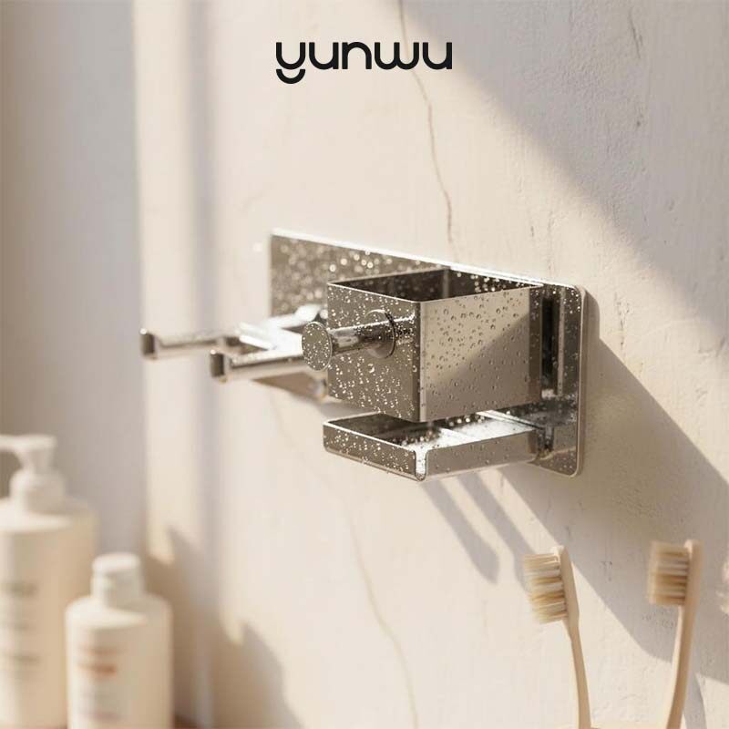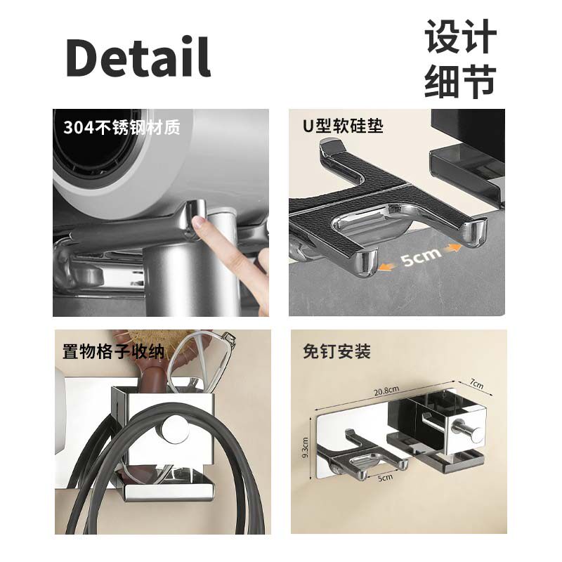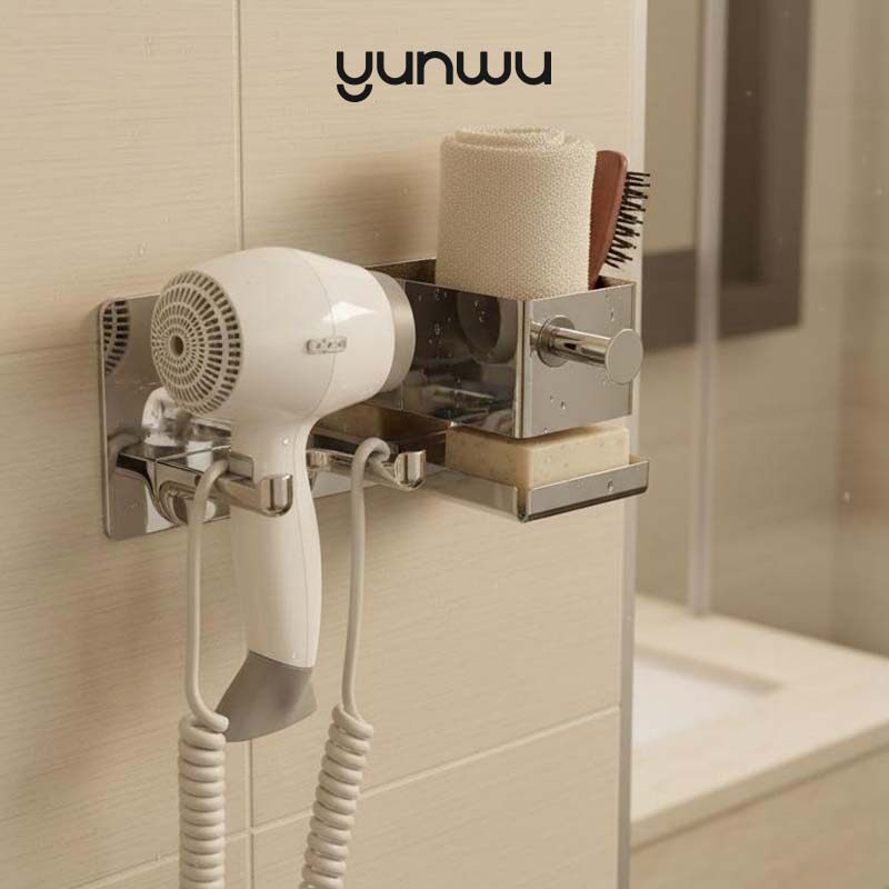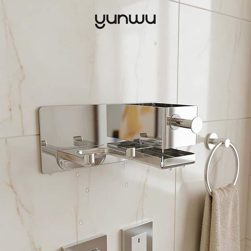 云物生活浴室壁挂置物吹风机收纳架,采用优质304不锈钢材质,防锈耐腐蚀,坚固耐用,适合潮湿的浴室环境。免钉安装设计,无需打孔,不伤墙面,通过强力胶贴或吸盘即可稳固上墙,安装简便,拆卸不留痕。架体结构科学合理,专为吹风机、卷发棒等美发工具设计,兼具置物与收纳功能,有效节省空间,保持浴室整洁有序。表面光滑细腻,易清洁打理,现代简约外观适配多种装修风格。无论是出租屋还是自住房,都能轻松提升浴室使用体验,是实用与美观兼具的理想收纳之选。