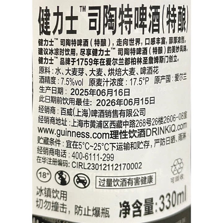 健力士黑啤酒(Guinness)源自爱尔兰都柏林,拥有260余年悠久历史,是世界知名的世涛精酿啤酒代表。这款330ml×24瓶装整箱装精选爱尔兰原装进口,采用大麦烘烤、啤酒花与酵母精心酿造,呈现标志性的深黑色泽与绵密奶油般泡沫。入口顺滑,融合咖啡、巧克力和焦糖的丰富层次,苦甜平衡,回味悠长。其独特的氮气注入技术带来丝绒般口感,被誉为“液体黑金”。无论是纯饮还是搭配美食,健力士都展现经典爱尔兰工艺与品质,是精酿爱好者与品质生活追求者的理想之选。