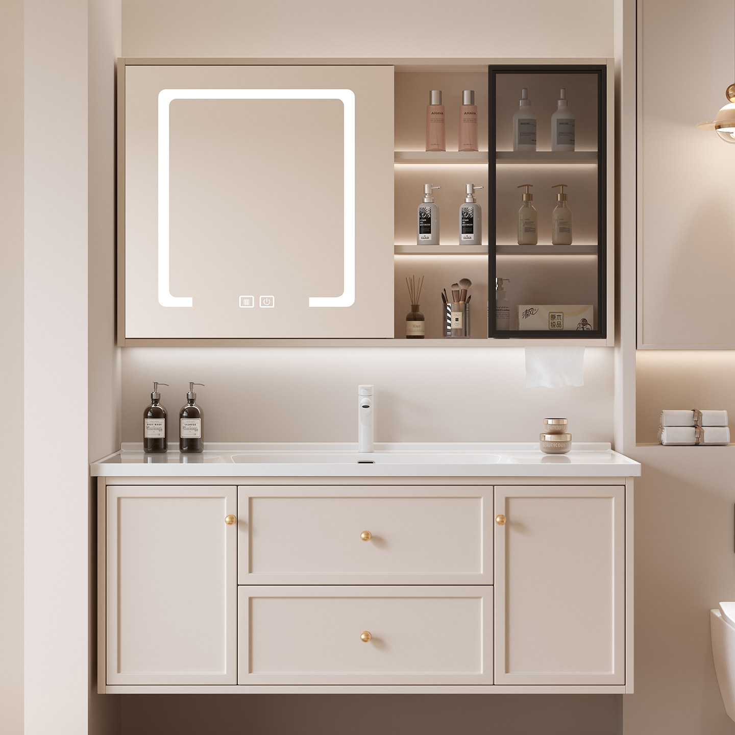 这款卫生间奶油风智能浴室柜,以温润奶油色调搭配简约线条,营造温馨治愈的卫浴空间。采用多层实木材质,结构稳固、防潮耐用,环保健康。陶瓷一体盆设计无缝易洁,有效防止污垢堆积,日常打理更轻松。柜体搭配智能镜柜,集成LED照明、除雾、蓝牙音响等功能,提升使用体验。多层收纳设计合理分区,满足洗漱用品、毛巾等收纳需求。整体风格柔和雅致,兼具美观与实用性,是现代家居提升生活品质的优选卫浴单品,适用于小户型或追求精致生活的主卫、客卫空间。