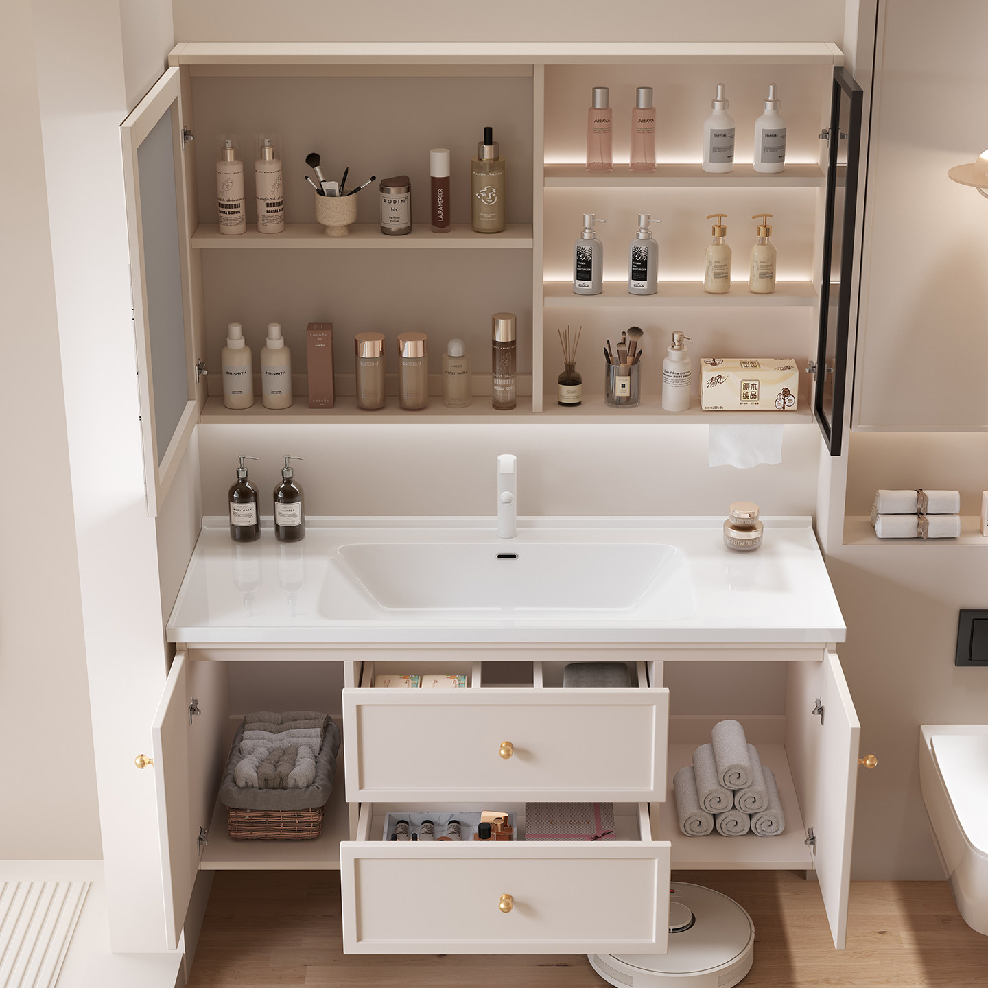 淘宝卫生间奶油风智能浴室柜多层实木陶瓷一体盆洗手洗脸盆柜组合
