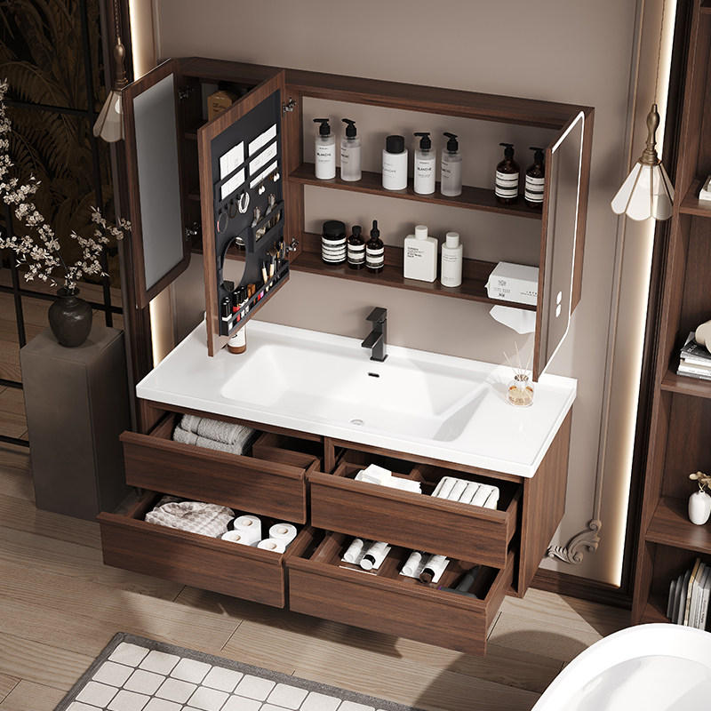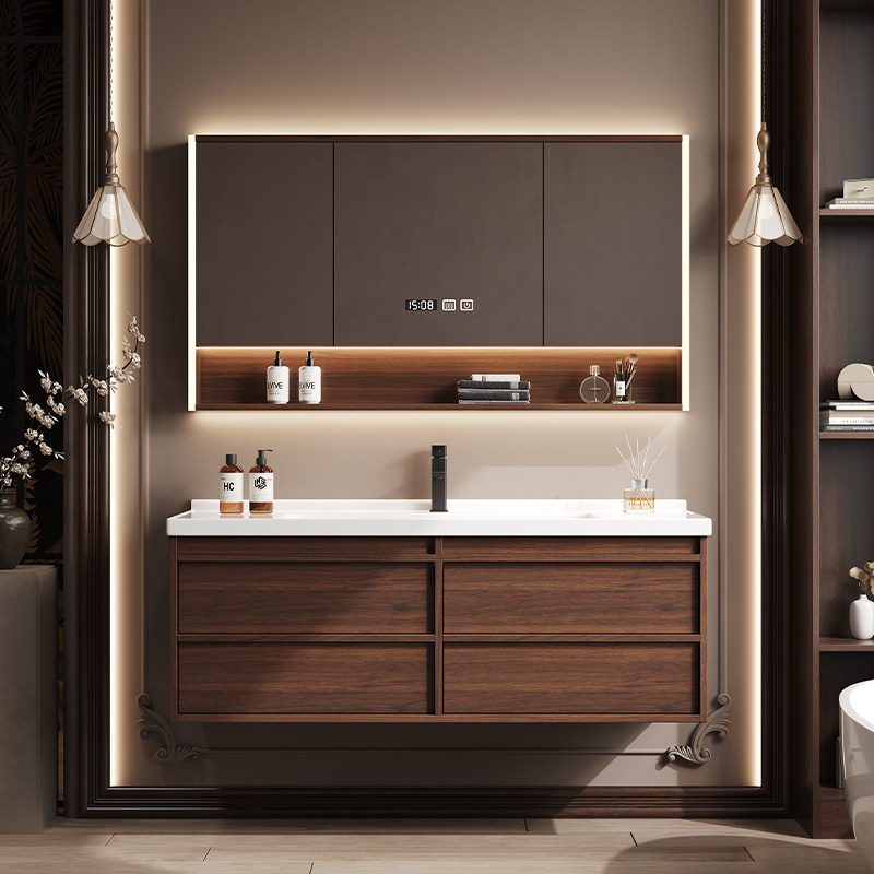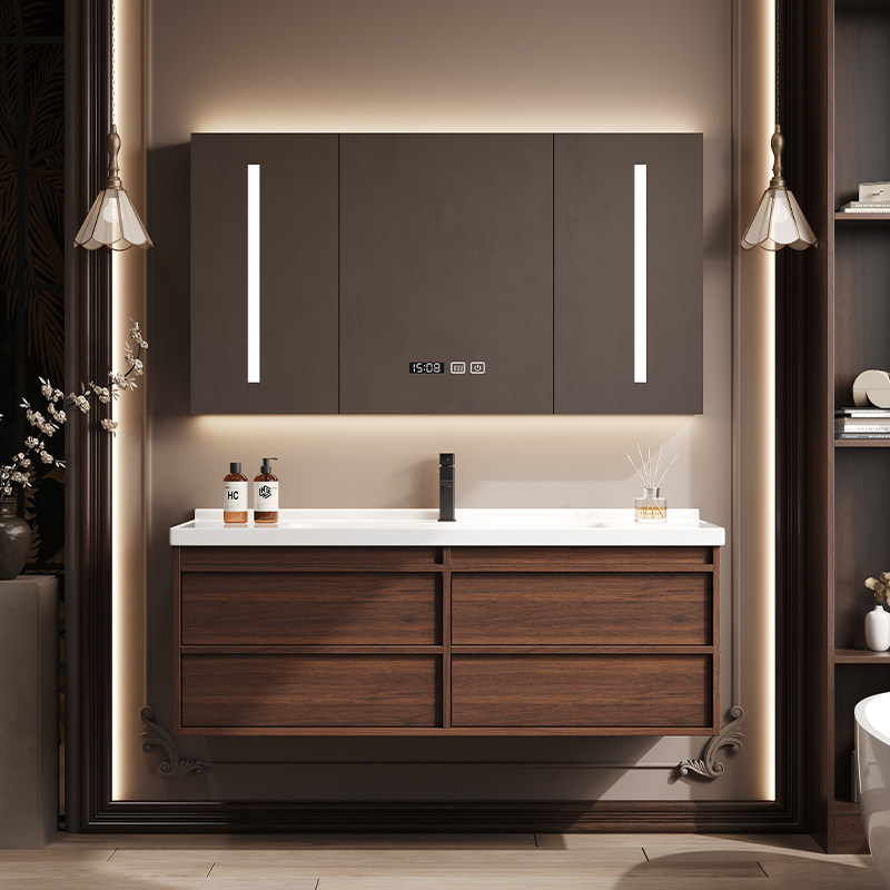 淘宝中古风浴室柜陶瓷一体盆胡桃木色洗手盆洗脸盆柜卫生间洗漱台套装