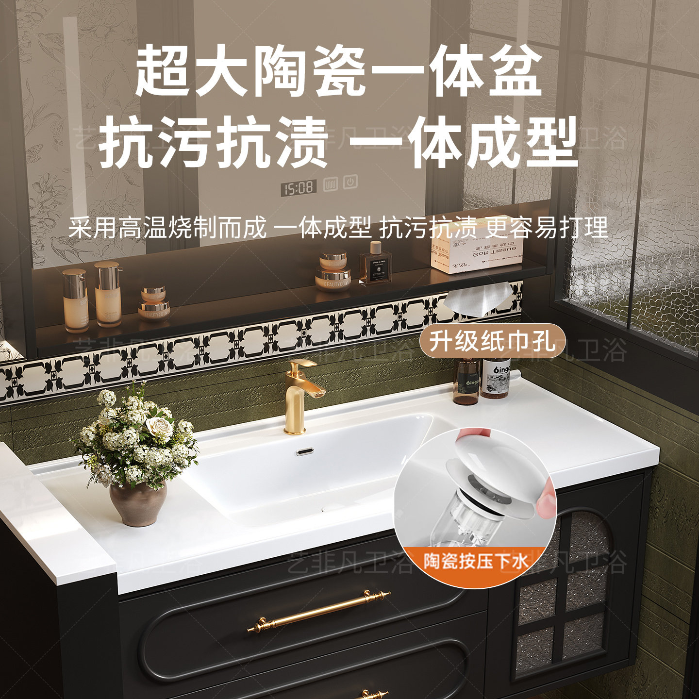 淘中古风岩板热弯陶瓷一体盆浴室柜组合卫生间洗手洗脸盆洗漱台定制