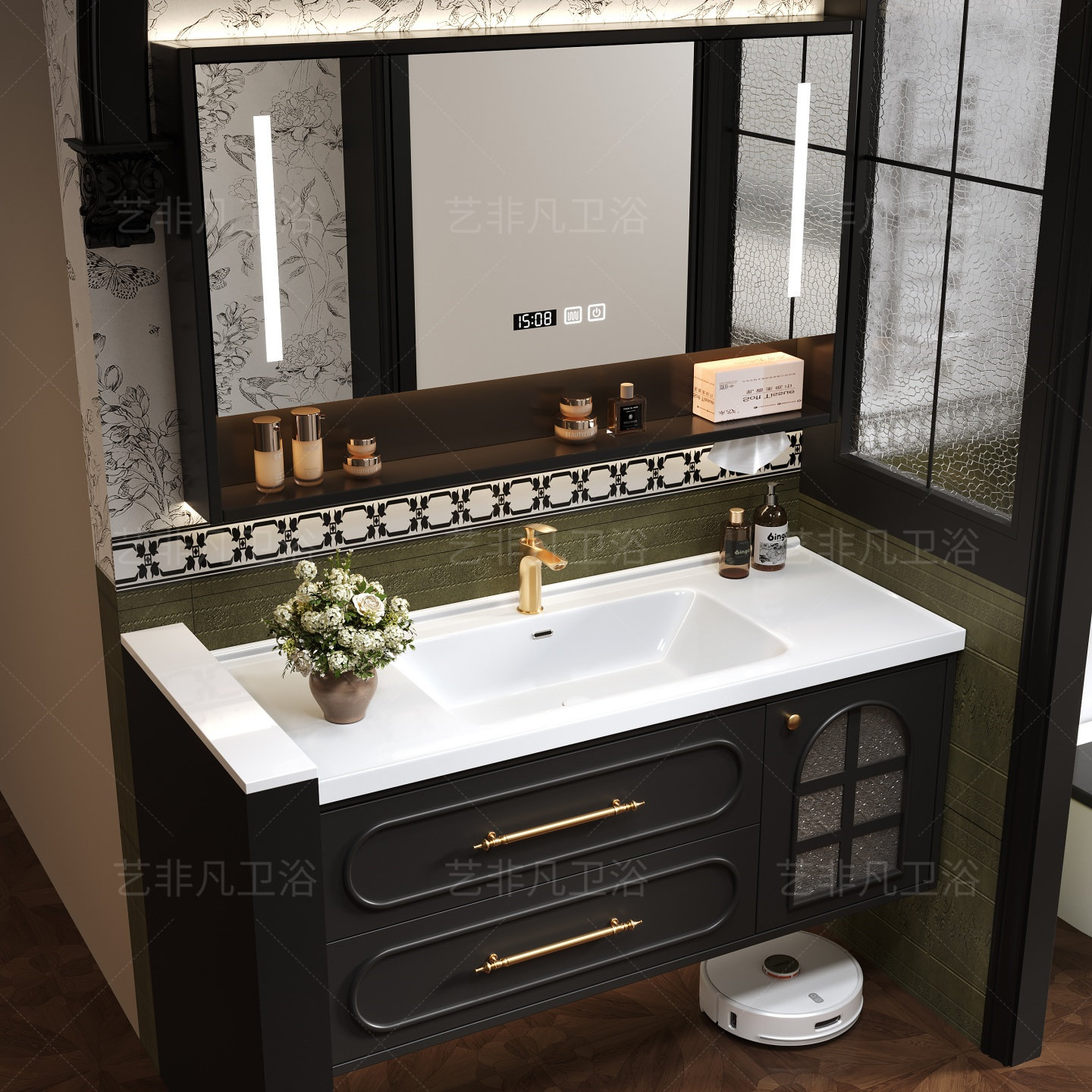 这款法式复古实木浴室柜组合,融合经典欧式美学与现代实用功能,采用优质实木打造,结构稳固、防潮耐用。柜体以深邃黑色为主调,搭配精致雕花与复古拉手,彰显典雅浪漫气息。搭配陶瓷一体盆,表面光滑易清洁,无缝设计有效防止污垢堆积,提升使用体验。整体造型优雅大气,既适合复古风格卫浴空间,也能为现代家居增添一抹艺术韵味。无论是小户型还是大空间,都能完美融入,兼具美观与实用性,是提升浴室格调的理想之选。