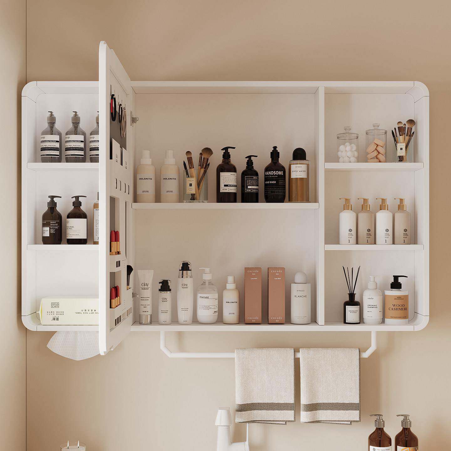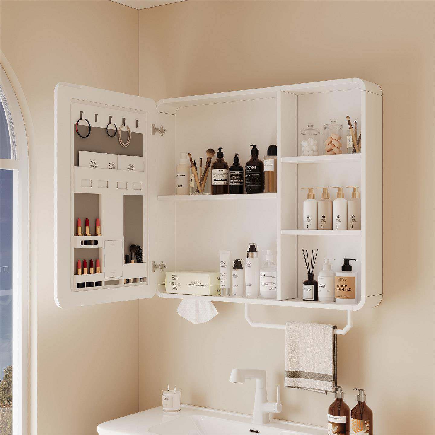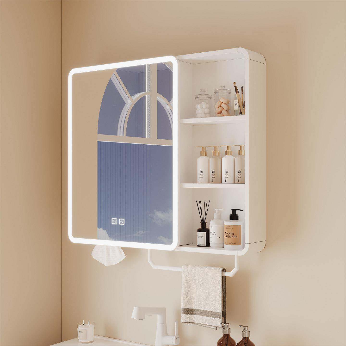 这款圆角太空铝智能浴室镜柜,集美观与实用于一体,专为现代卫生间设计。采用高强度太空铝材质,防潮防腐,经久耐用。圆角设计安全防撞,提升使用安全性。镜柜内置多层储物空间,搭配美妆收纳架,可整齐收纳护肤品、化妆品及日常用品,让台面更整洁。智能触控LED灯带,提供柔和均匀照明,支持三色调光与除雾功能,满足化妆、剃须等精细需求。挂墙式安装节省空间,适合各种户型。镜面清晰高亮,兼具梳妆镜与收纳箱功能,是提升浴室品质的理想之选。