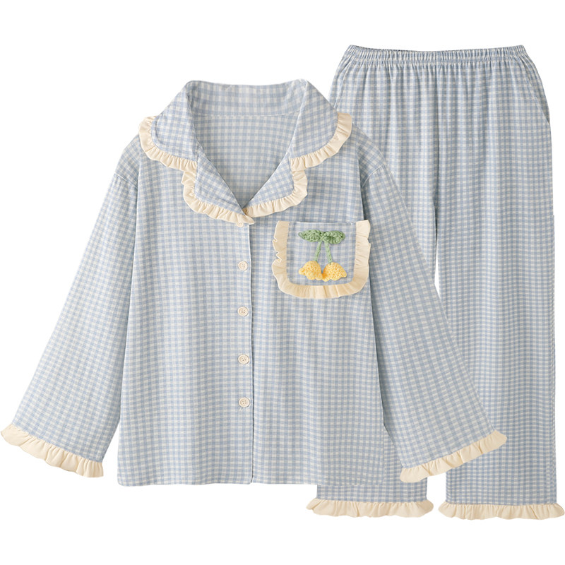 淘宝〖铃兰物语〗日系简约格子纯棉情侣睡衣女春秋款长袖睡衣男家居服