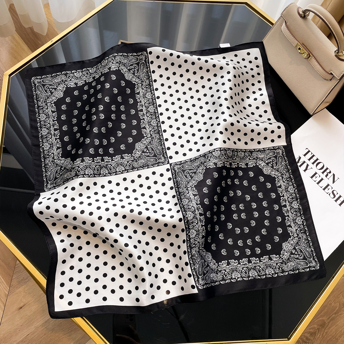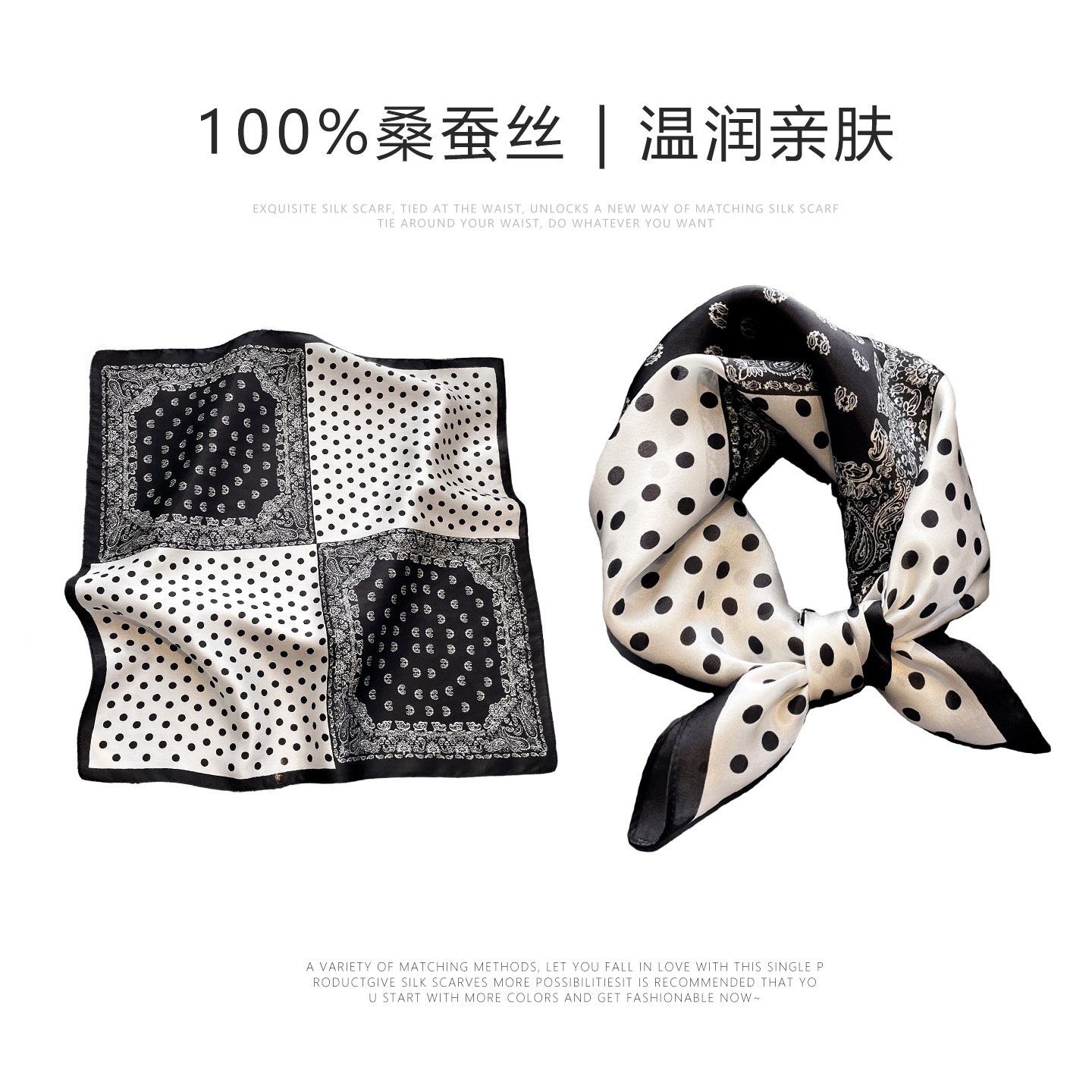 2026年春季新款黑白波点丝巾小方巾,以经典黑白配色融合复古波点元素,打造优雅高级感。采用轻盈透气的优质真丝或仿真丝面料,触感柔滑,垂坠感佳,春季佩戴舒适不闷热。小巧方巾设计百搭实用,可系于颈间、包袋或发饰,轻松点缀整体造型,展现知性气质与时尚品味。精致锁边工艺彰显品质细节,既可作为护颈保暖单品,又为春日穿搭增添一抹亮眼点缀。无论是通勤、约会还是休闲出行,这款丝巾都能为你提升格调,演绎低调奢华的法式风情,是女性衣橱中不可或缺的时尚配饰。