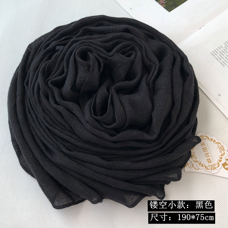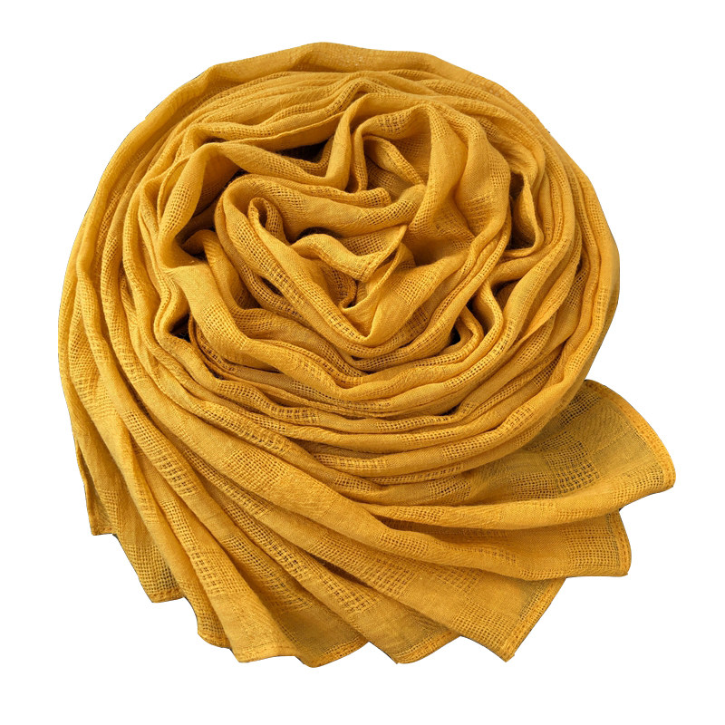 淘宝春秋冬季纯棉麻围巾女姜黄米色纯色镂空网格韩版文艺长款披肩丝巾