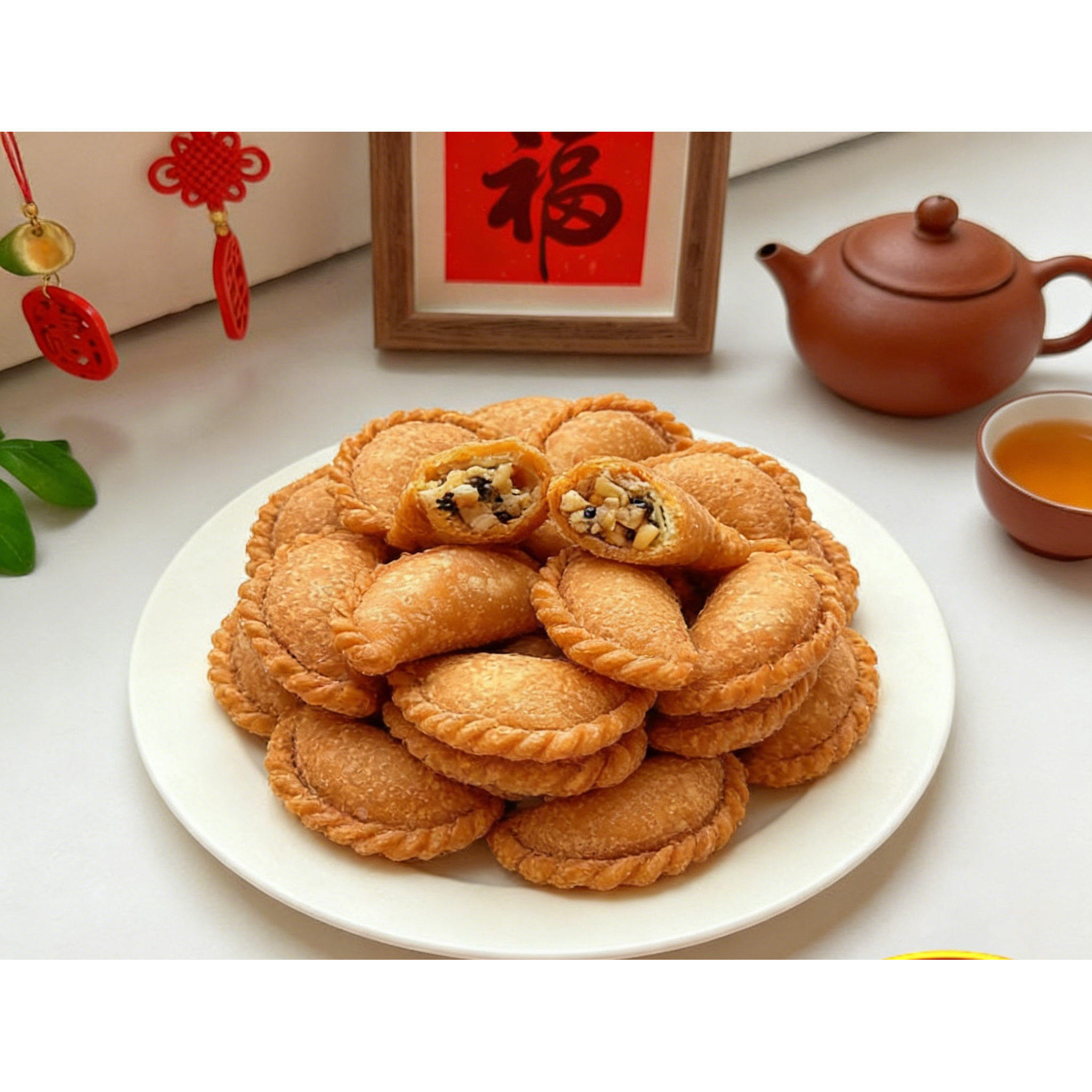 潮汕酥饺,又称脆皮油角,是潮汕地区传统手工小吃,承载着浓浓的年味与乡愁。以优质面粉揉制薄皮,包裹花生、芝麻、糖等香甜馅料,捏成金元宝状,经传统油炸至金黄酥脆,外皮层层起酥,内馅香甜可口。每逢春节,家家户户备此年货,寓意招财进宝、生活美满。如今,酥饺采用独立包装,既保留传统风味,又便于保存与分享,成为老少皆宜的怀旧零食。一口咬下,酥脆声响间,仿佛回到童年围炉守岁的温馨时光,是潮汕人心中不可替代的味觉记忆。