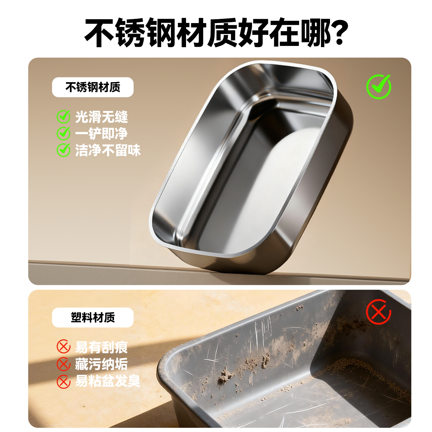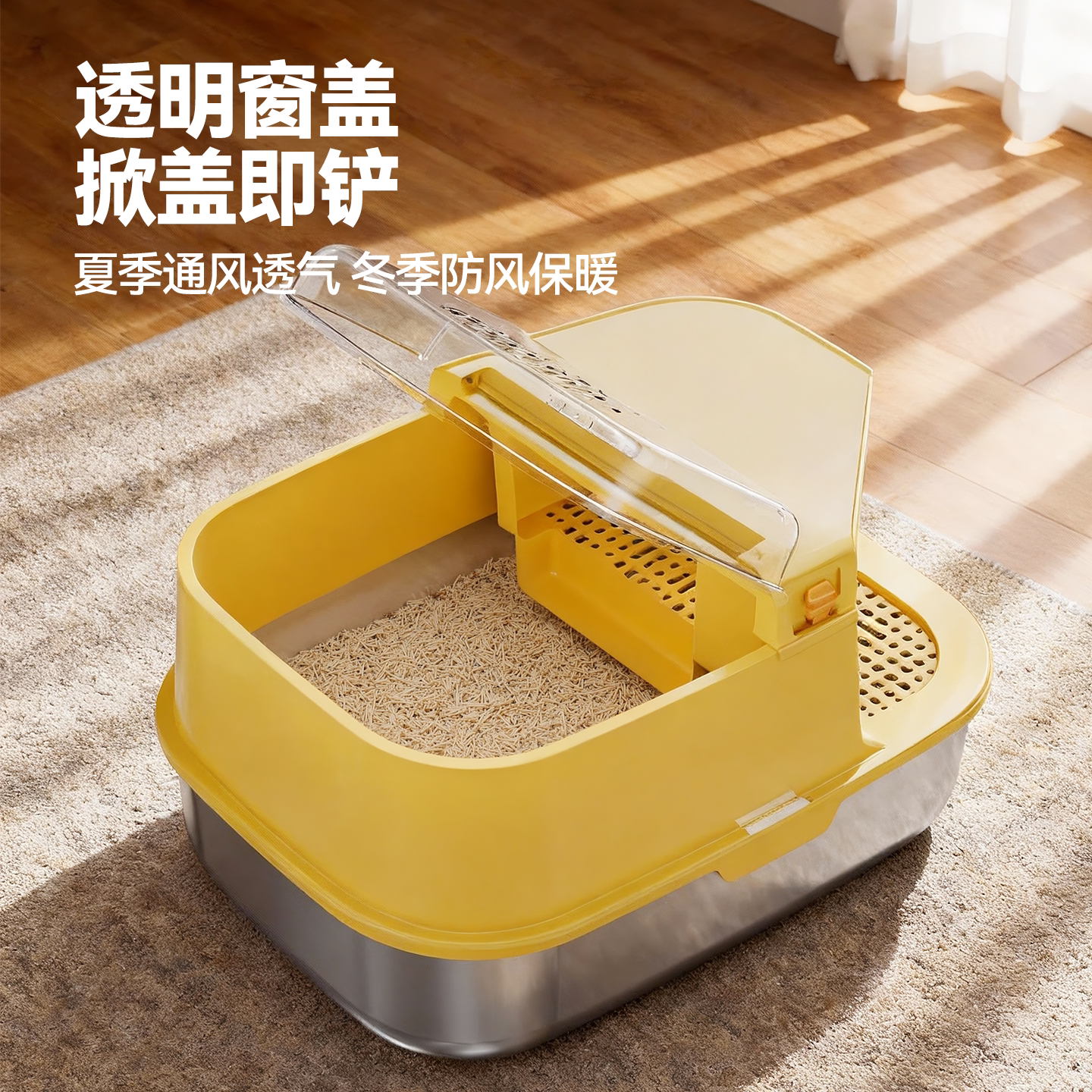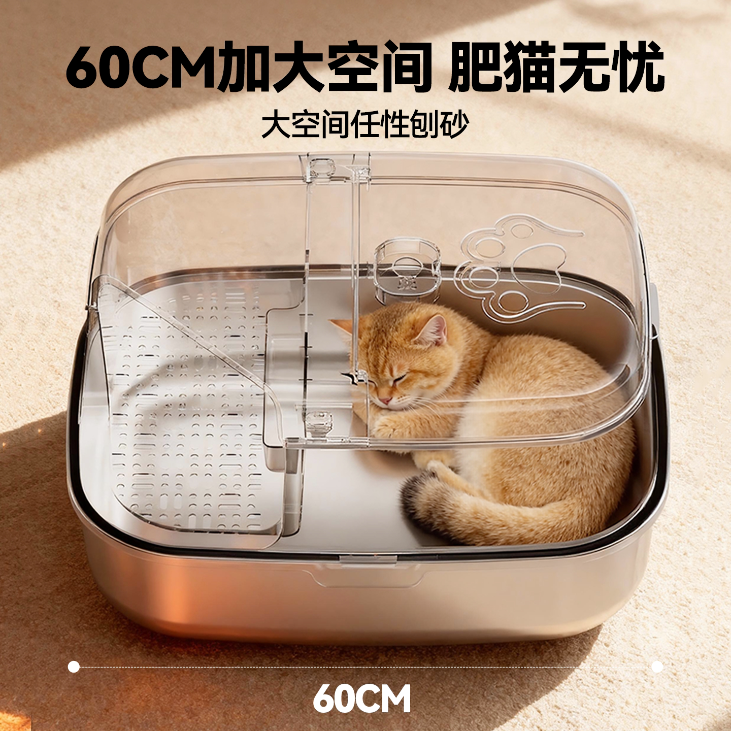 这款超大号不锈钢猫砂盆采用全封闭走廊式设计,有效防止猫砂外溅,保持家居整洁。精选优质304不锈钢材质,坚固耐用、防锈防腐,清洁更省心。独特的掀盖结构搭配回廊式入口,既保障猫咪隐私,又减少异味外溢,显著提升除臭效果。内部空间宽敞,适合多猫家庭或大型猫咪使用。底部加深设计,配合可拆卸顶盖,方便清理与更换猫砂。整体简约美观,适配多种家居风格,为爱宠打造舒适、卫生的如厕环境,是注重品质与健康养猫家庭的理想选择。
