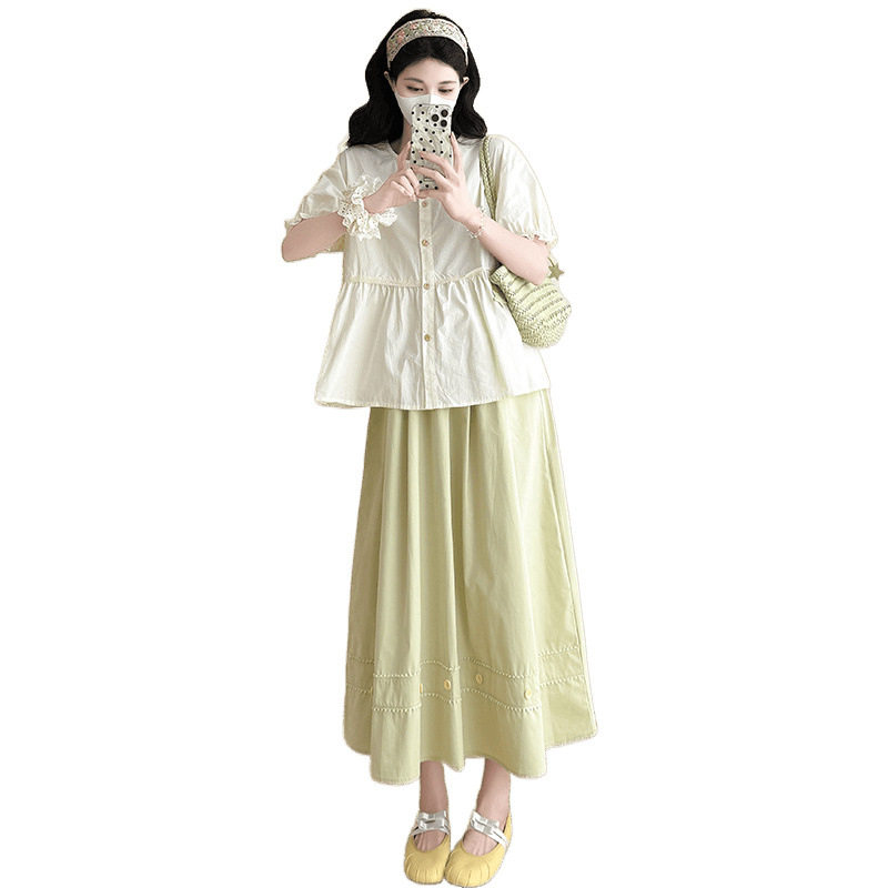淘宝孕妇装2025夏季新款小个子圆领减龄浅杏色娃娃衫小清新半身裙