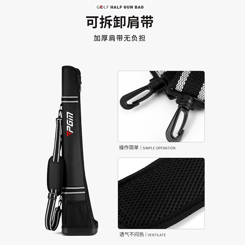 PGM高尔夫球包是一款专为男女及儿童设计的便携式球杆包,外形时尚轻便,采用耐用防水面料,结构稳固。该球包小巧紧凑,可轻松容纳4-5支高尔夫球杆,适合初学者、青少年或短途练习使用。配备舒适可调节肩带,支持手提或背负,出行更便捷。包体设有多个功能口袋,可存放球tee、手套、手机等小物品,实用性强。枪型外观设计新颖,兼具运动感与实用性,是日常练球、球场训练或亲子活动的理想选择。PGM以高性价比和人性化设计,满足轻量化高尔夫运动需求。