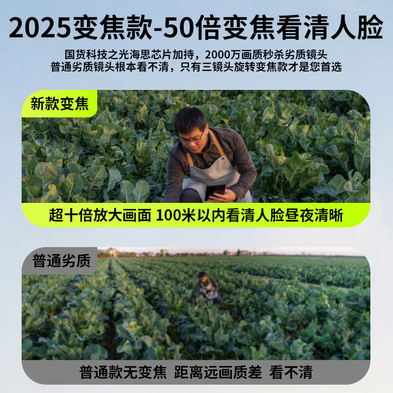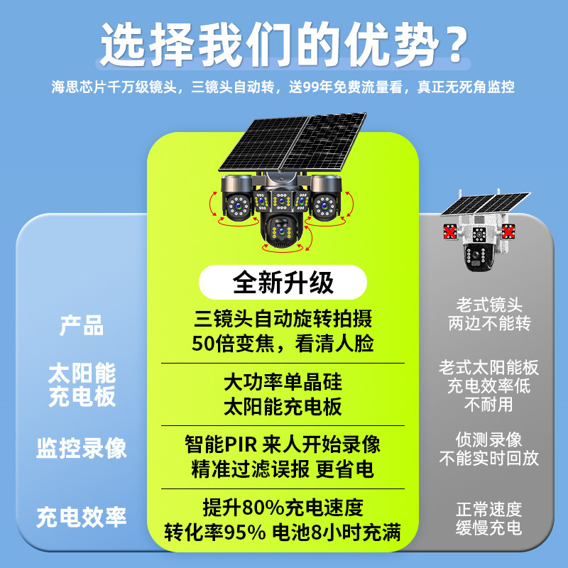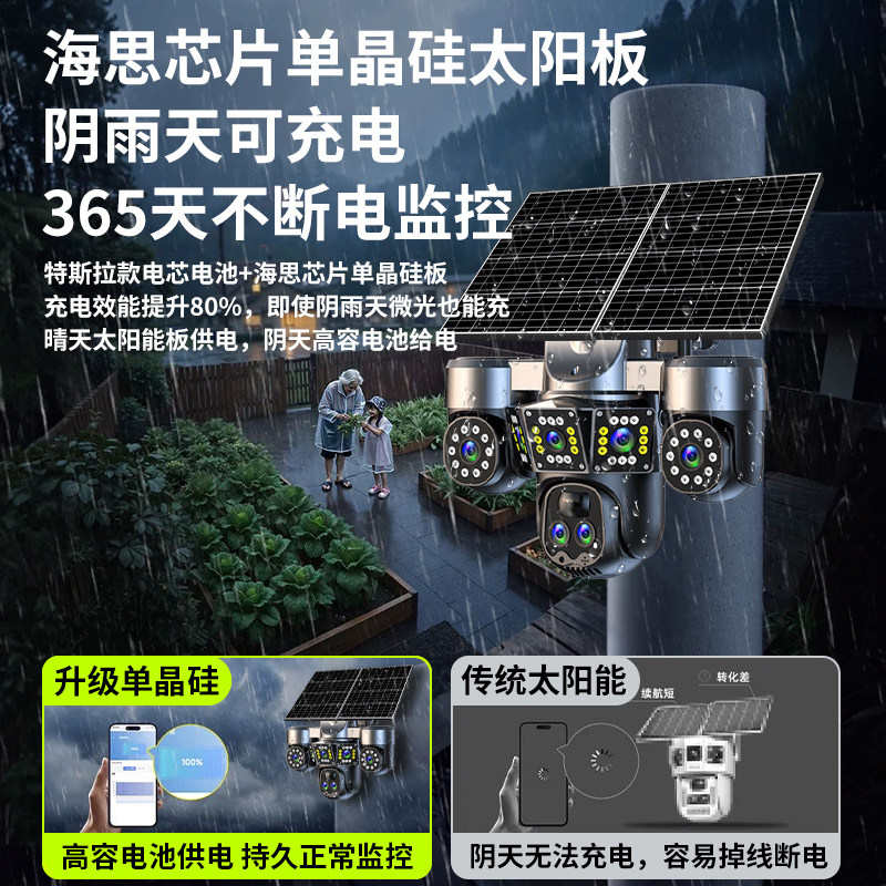 太阳能监控器是一款专为户外环境设计的智能安防设备,采用高效太阳能板供电,无需外接电源,真正实现免插电、无电运行。内置大容量锂电池,可在阴雨天持续工作,保障全天候监控。支持360度全景旋转,实现无死角覆盖,搭配高清夜视功能,白天黑夜都能清晰记录。无需网络布线,支持4G/Wi-Fi双模连接,手机远程实时查看、回放录像,操作便捷。防水防尘设计,适应各种恶劣天气,广泛应用于农场、工地、庭院、仓库等无电无网区域,是户外安防的理想选择,真正实现“零布线、零电费、高安全”的智能监控体验。