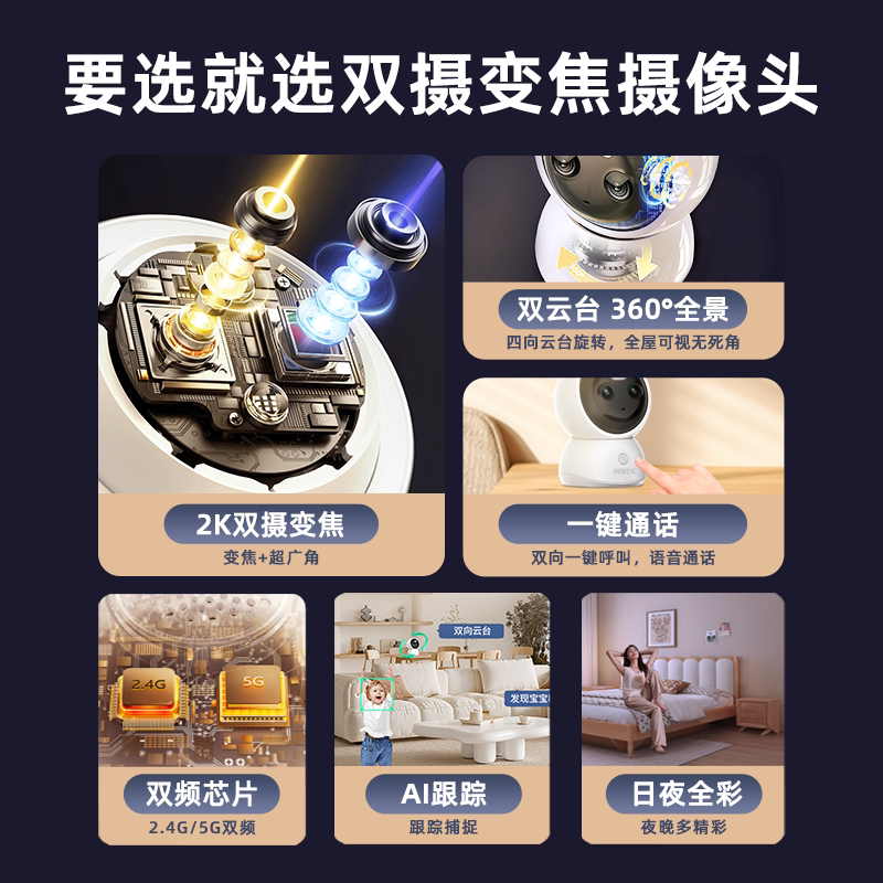 360摄像头云台双摄500万家用监控全彩夜视无线WiFi摄像机360度全景无死角