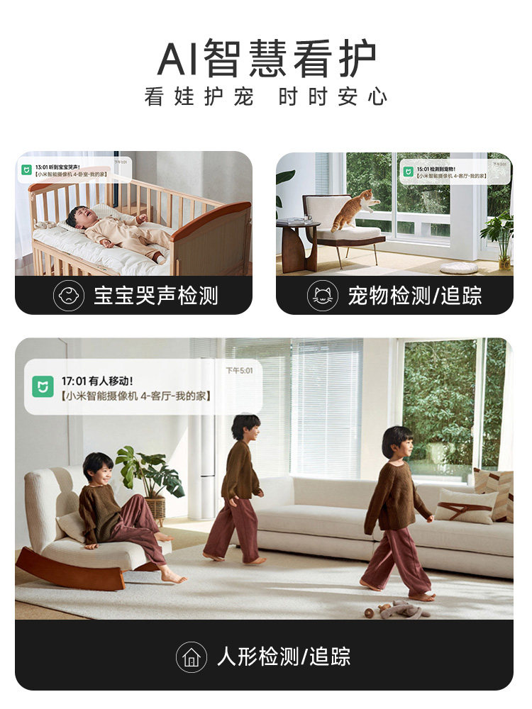小米智能摄像头4云台版是一款专为家庭安防设计的高清监控设备,支持360°全景水平旋转和垂直大范围俯仰,实现无死角监控。搭载1080P高清镜头,画质清晰细腻,配备红外夜视功能,夜间也能呈现明亮画面。支持手机远程实时查看、双向语音通话及移动侦测报警,用户可通过米家APP随时随地掌握家中动态。内置Wi-Fi模块,连接便捷,支持云存储与本地MicroSD卡存储,保障录像安全。小巧机身搭配简约设计,适配多种家居环境,是守护家庭安全的智能之选。