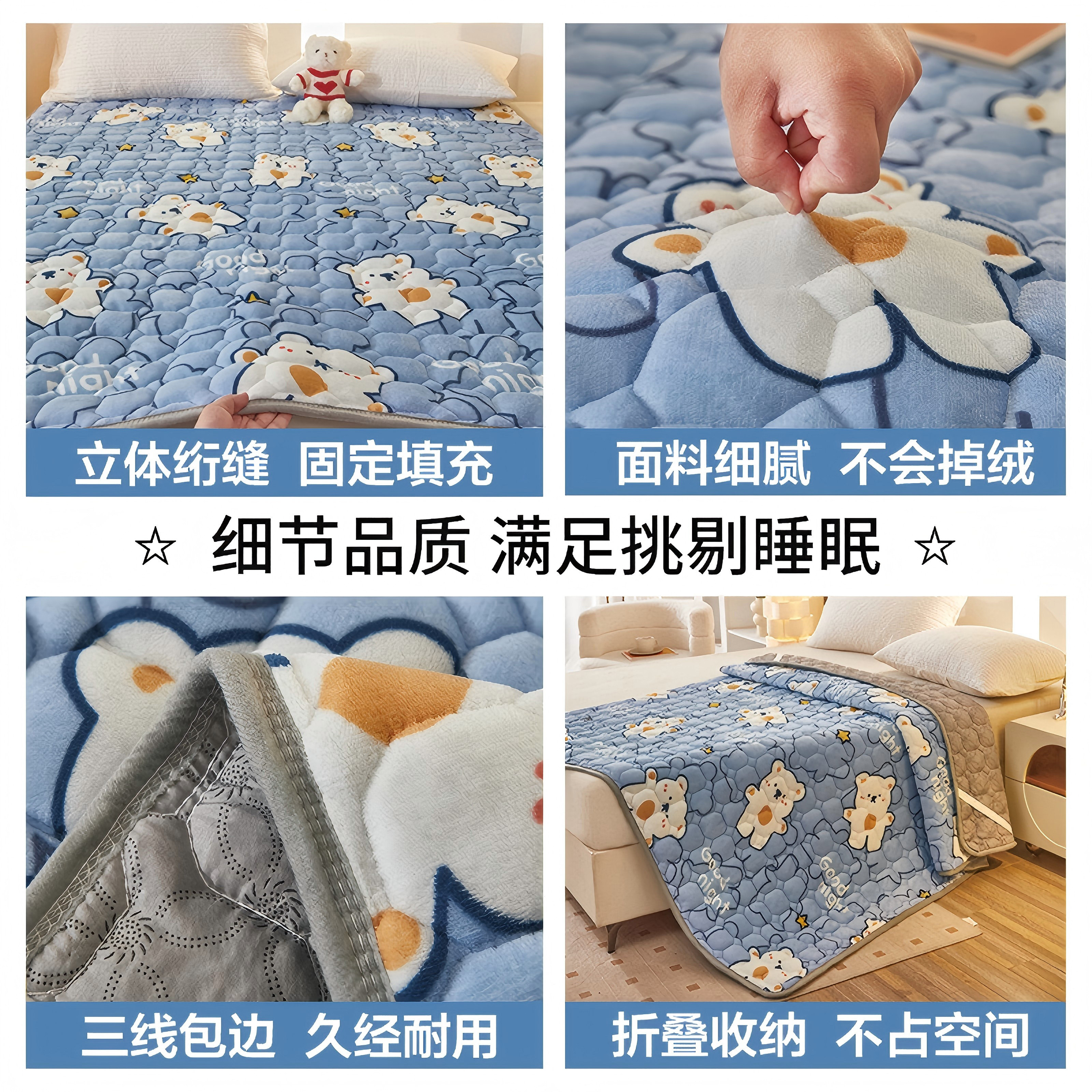 A类牛奶绒床垫是一款专为冬季保暖设计的家用软垫褥,采用高品质A类母婴级安全标准牛奶绒面料,柔软亲肤、透气防螨,呵护敏感肌肤。内部填充高密度保暖纤维,厚实蓬松,有效锁温,即使在寒冷冬季也能提供温暖舒适的睡眠体验。适用于家庭、宿舍、学生公寓等多种场景,铺于床板或现有床垫上, instantly提升睡眠舒适度。防滑底面设计,稳固不易移位,清洗方便,耐用易打理。多尺寸可选,满足不同床铺需求,是冬季居家、宿舍保暖的理想选择,让温暖从“垫”开始。