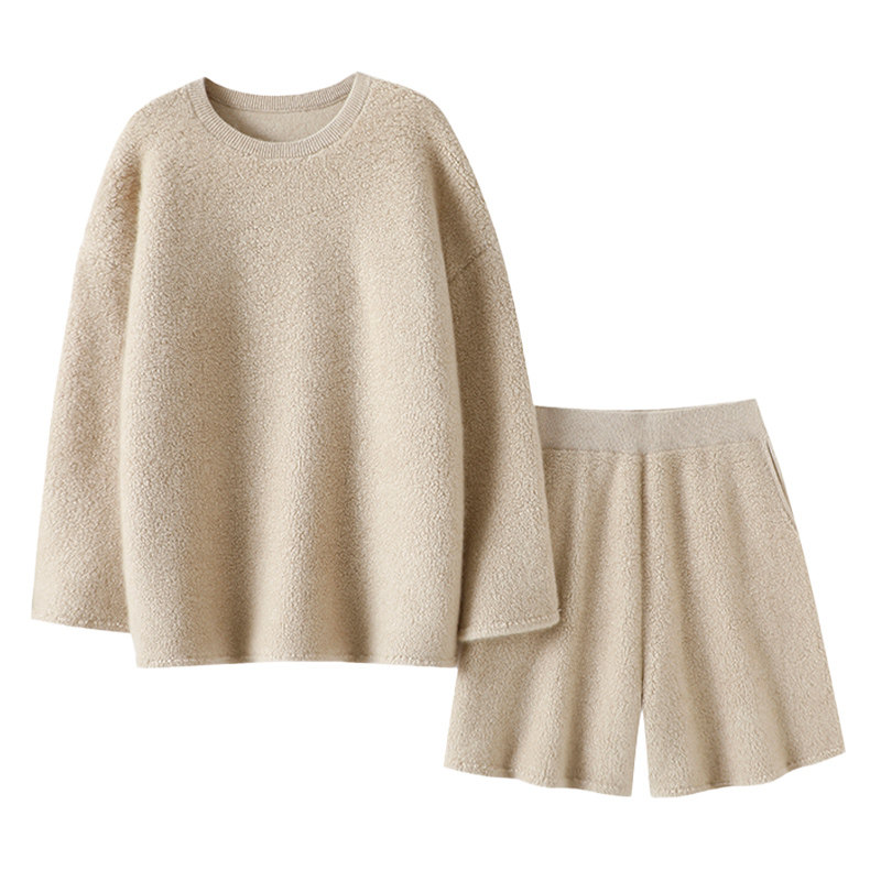 天猫重工牛货!加厚100%纯山羊绒衫女圆领毛衣宽松针织短裤秋冬套装