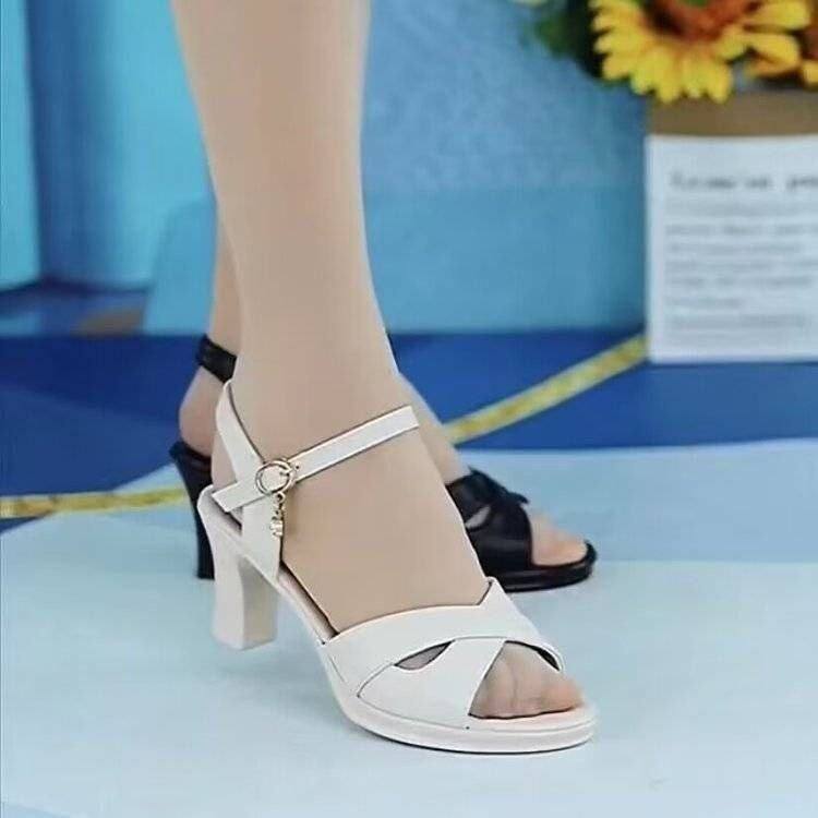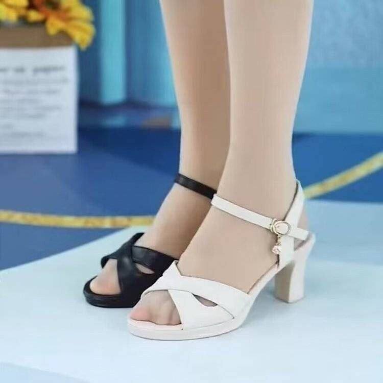 淘宝鱼嘴凉鞋女新款妈妈扣女士中跟软皮防滑凉鞋夏季2025百搭一字时尚