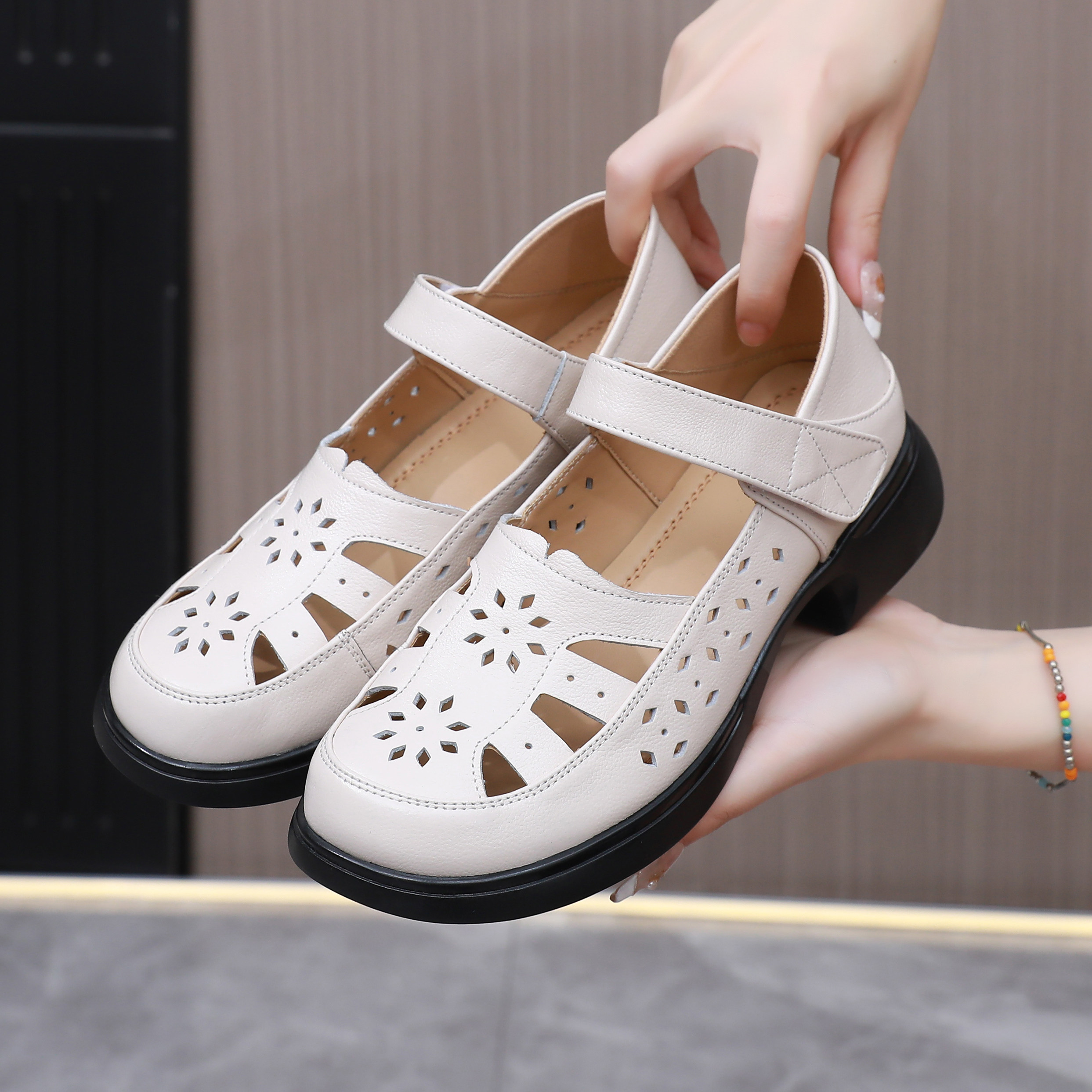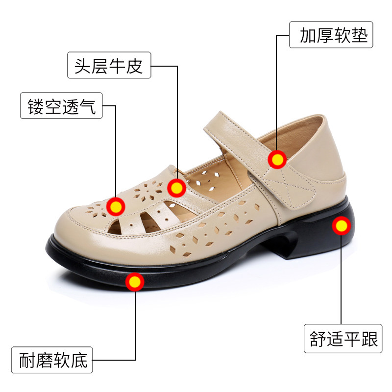 天猫罗马凉鞋女软底真皮大码低跟妈妈鞋厚底夏季透气复古镂空洞洞鞋女