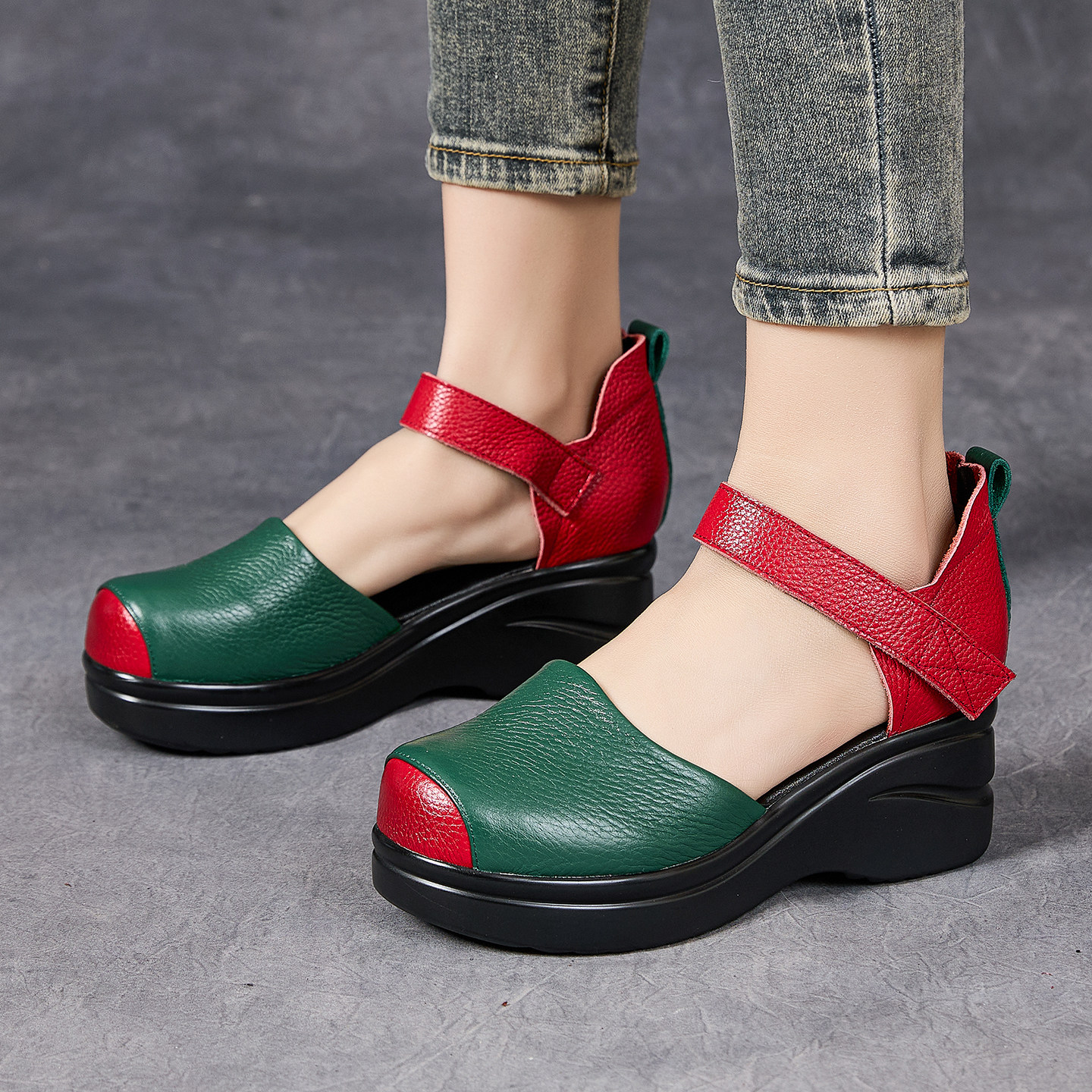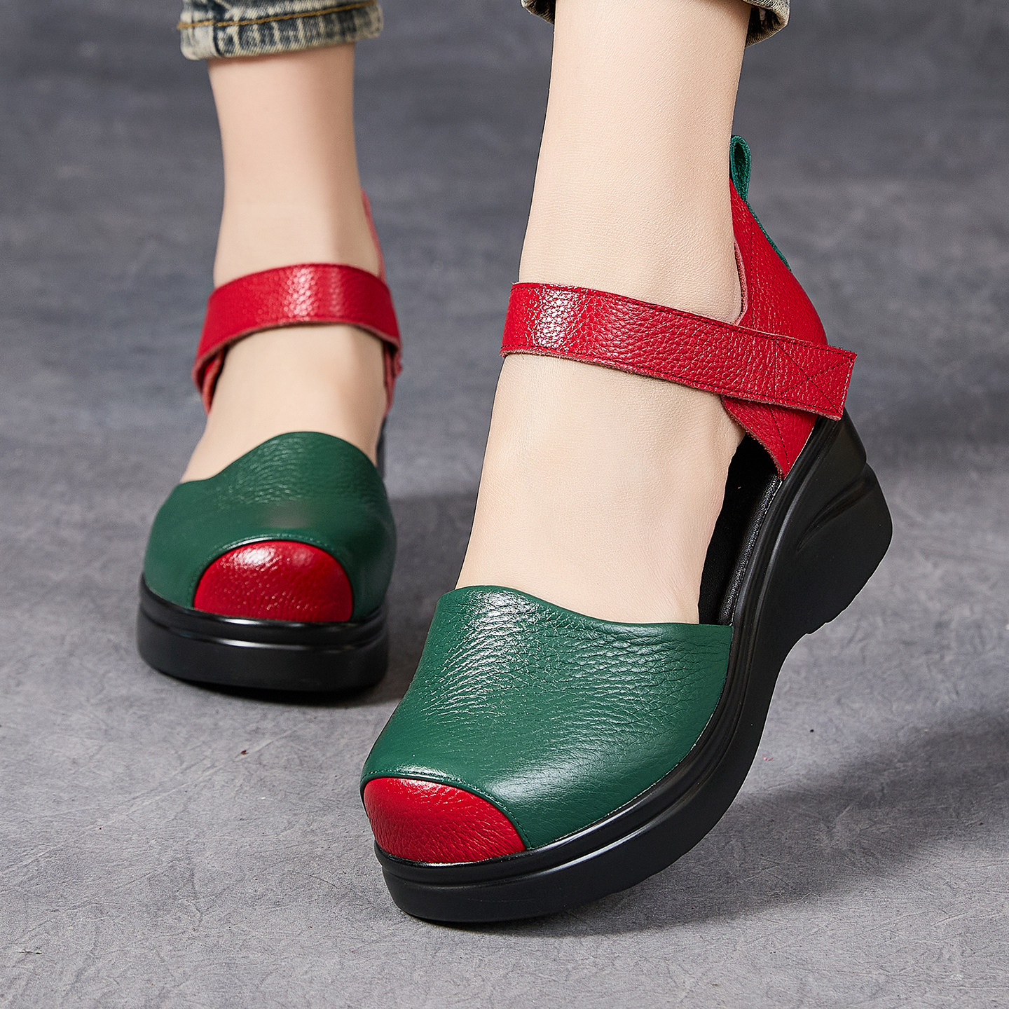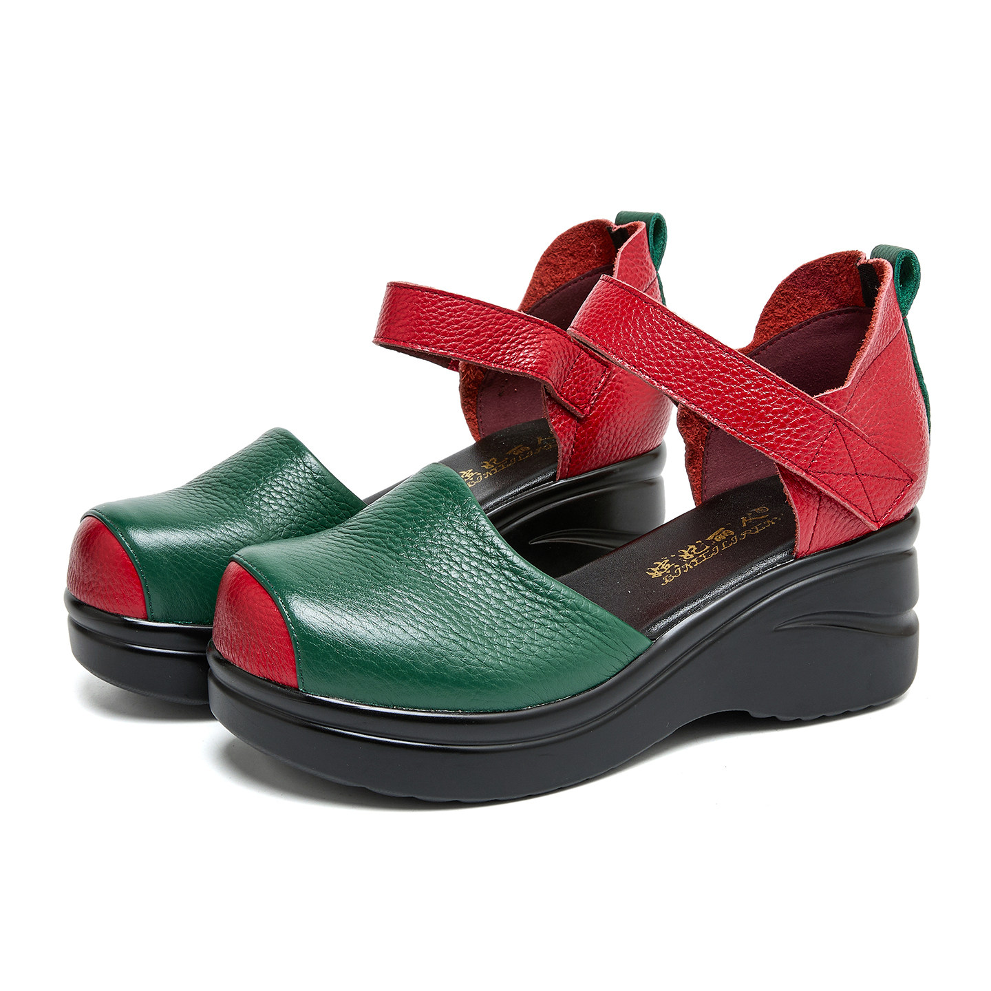 淘宝705复古风真皮拼色包头魔术贴凉鞋女厚底坡跟舒适妈妈休闲皮凉鞋