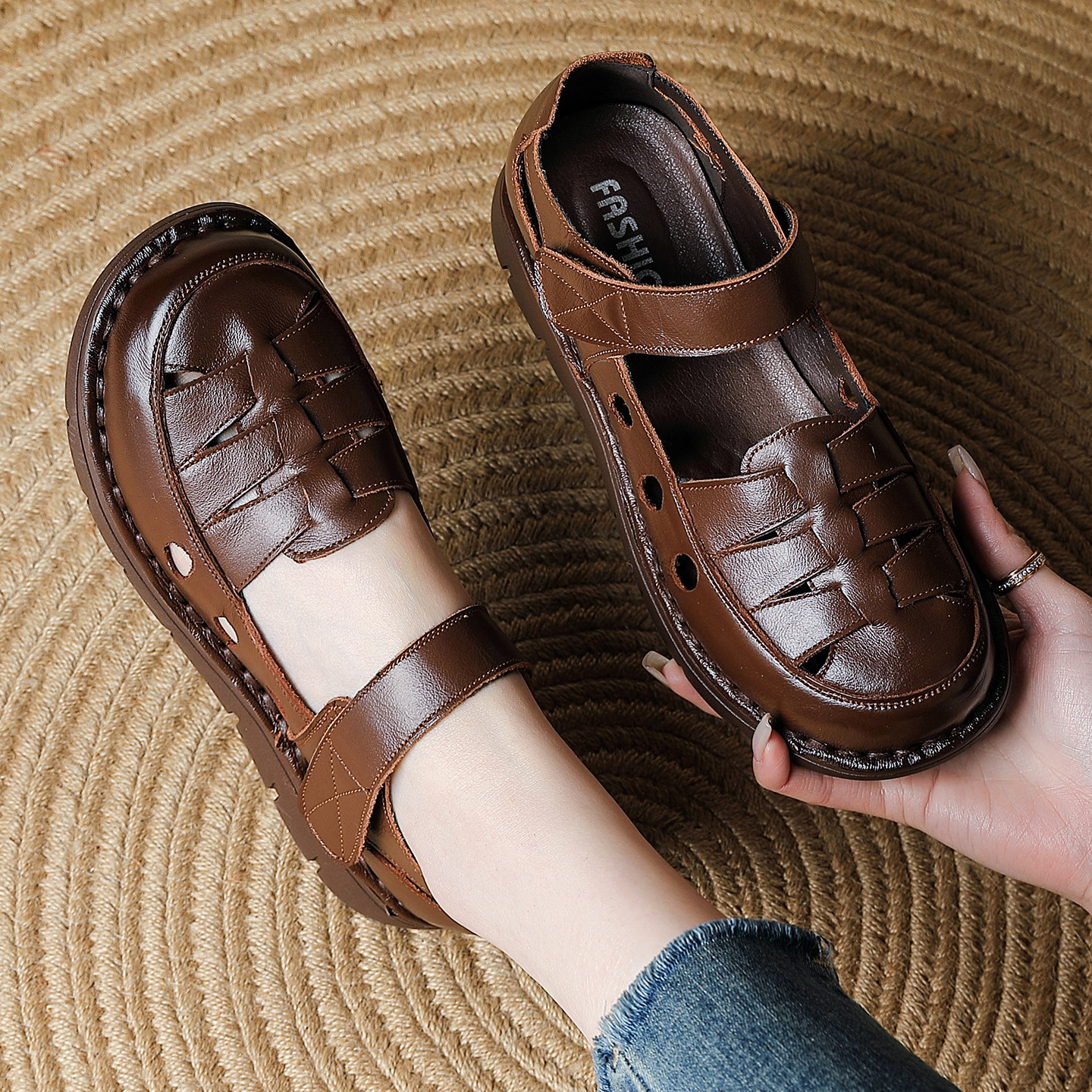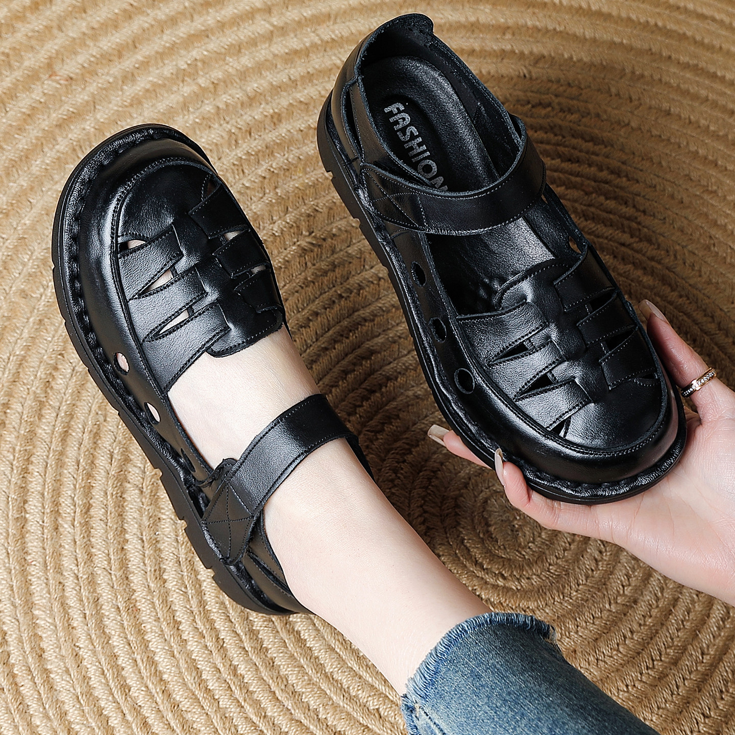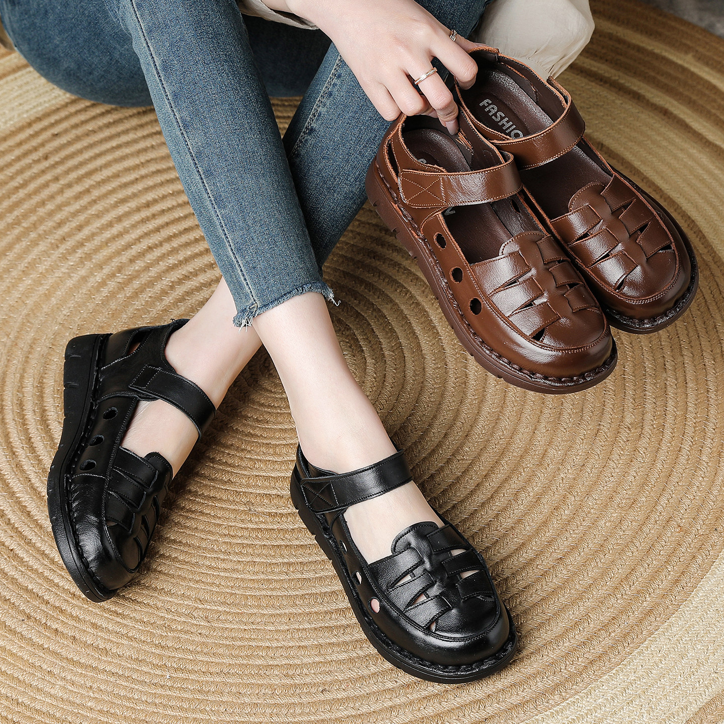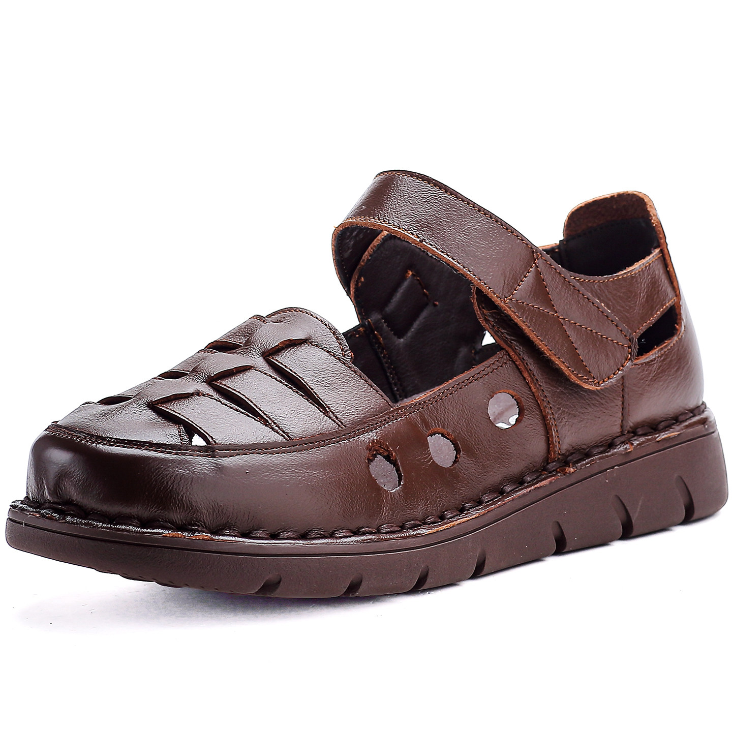 淘宝真牛皮复古坡跟凉鞋夏季软底防滑妈妈鞋宽胖脚松糕厚底罗马凉鞋女