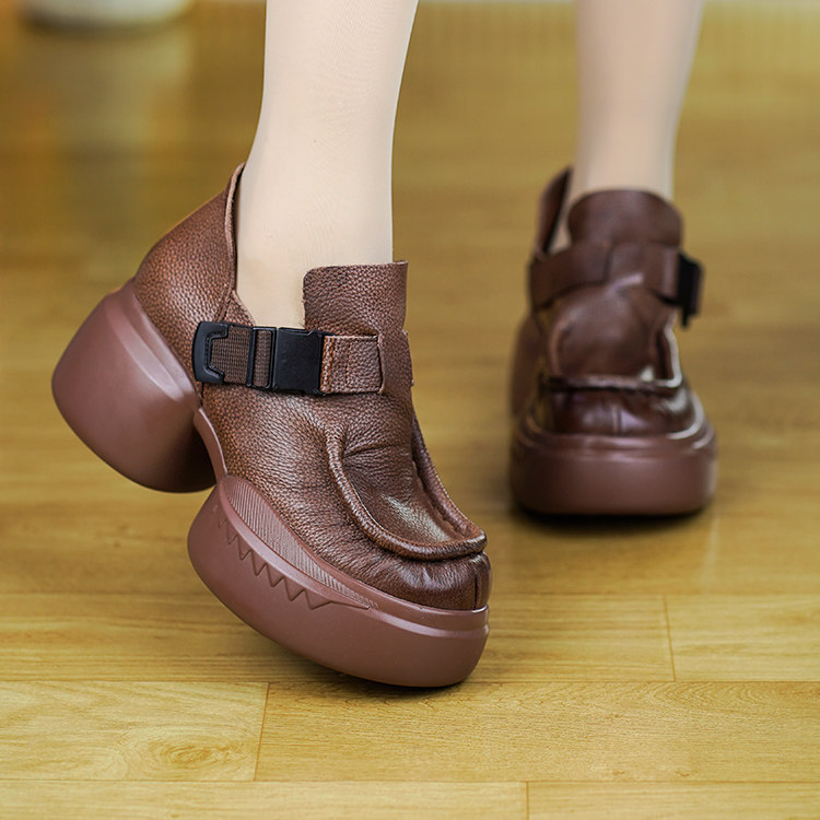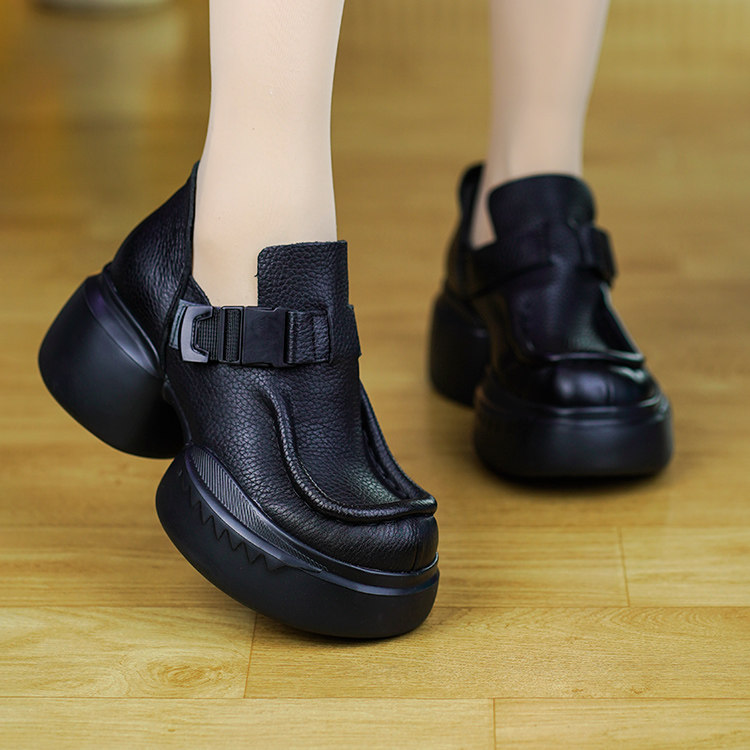 淘宝厚底一脚蹬真皮单鞋女春秋新款松糕休闲百搭民族风复古增高妈妈鞋