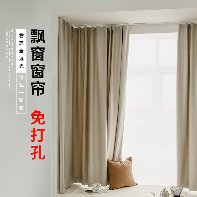 淘宝飘窗窗帘挂钩式奶茶色免打孔安装粘贴轨道一整套防晒卧室遮光布帘