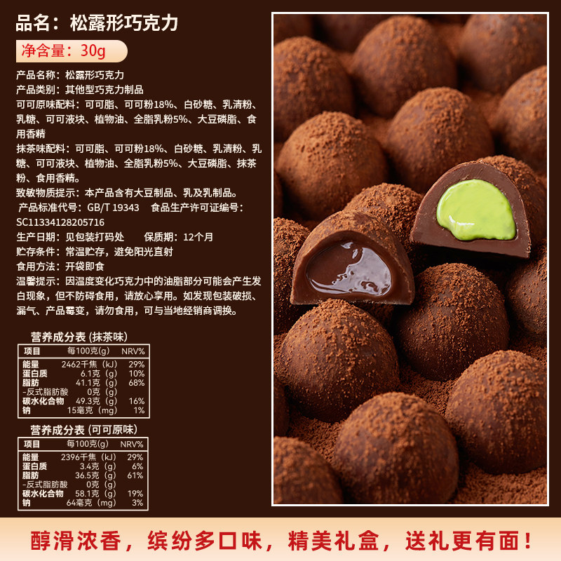松露形巧克力礼盒装,精选优质纯可可脂制作,口感丝滑浓郁,入口即化,完美复刻法式松露巧克力的经典风味。外形精致如宝石,细腻可可粉包裹,层次丰富,甜而不腻,是送礼、婚庆喜糖、节日馈赠的热门选择。礼盒包装精美大气,彰显品味,适合自用或批量批发。同时提供散装选项,满足聚会、活动、甜品台等多样需求。作为网红爆款小零食,深受年轻人喜爱,线上线下销量火爆。无论是情人节、生日派对,还是企业伴手礼,这款松露形巧克力都能传递满满心意,是兼具颜值与美味的甜蜜之选。
