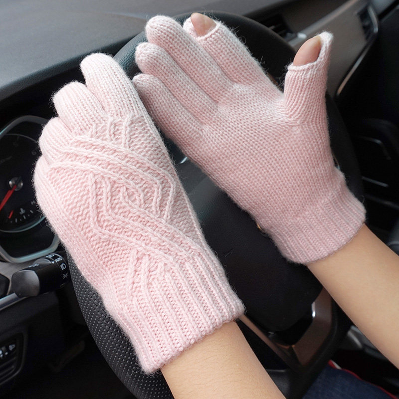 天猫克拉斯卡男女情侣款秋冬加绒保暖厚羊毛毛线露指触屏翻指半指手套