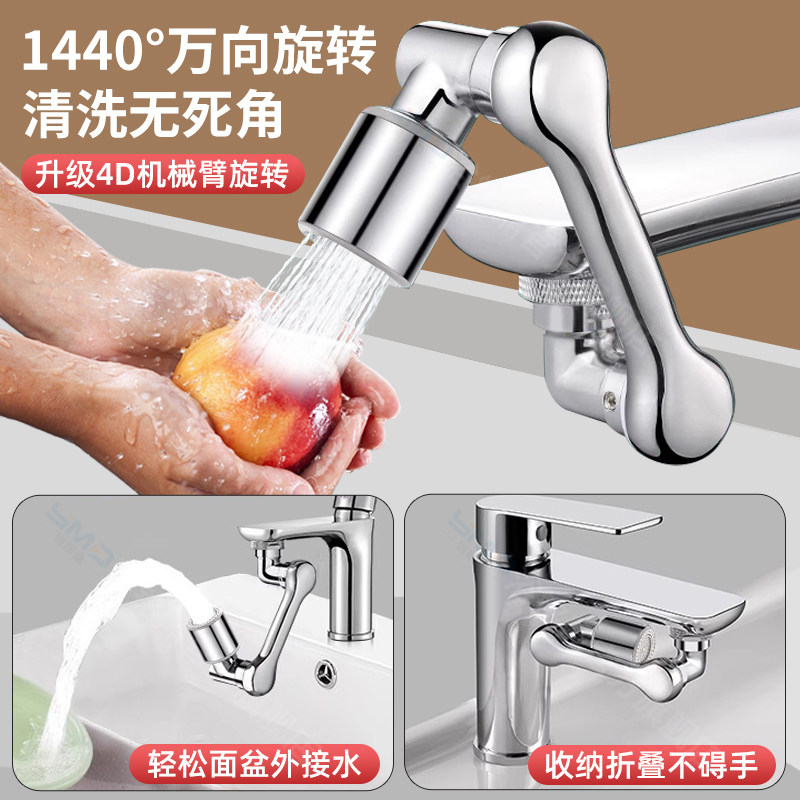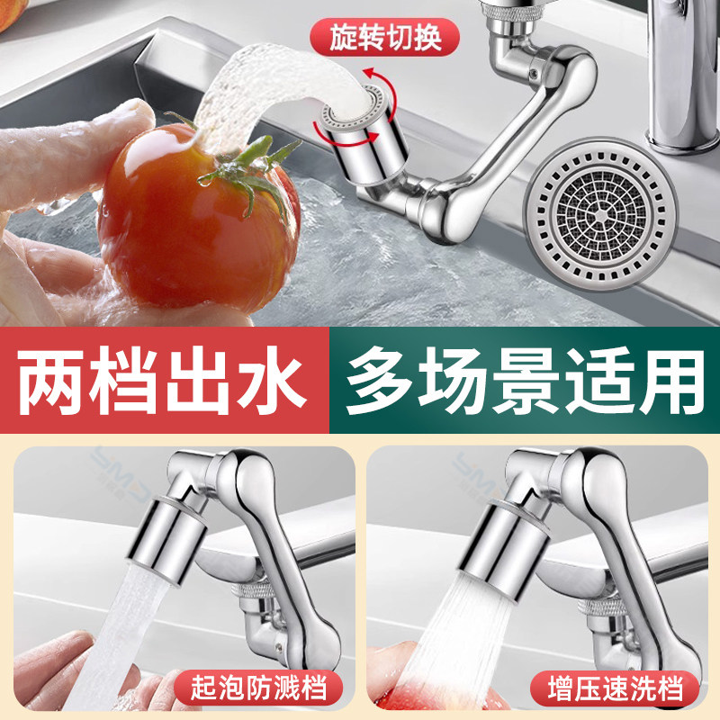 机械臂万向水龙头延伸器是一款创新厨房卫浴配件,专为解决洗脸盆溅水、出水角度不便等问题而设计。其采用灵活的多节摇臂结构,支持360°全方位旋转与多角度调节,轻松延伸出水范围,精准定位水流方向。内置高效起泡器,使水流柔和细腻,有效减少飞溅,节水的同时提升使用舒适度。适用于各种标准水龙头接口,安装简便,无需工具。无论是洗漱、洗菜还是清洁台面,都能带来更便捷、整洁的体验。防溅水设计特别适合有小孩或老人的家庭,是提升居家生活品质的实用小神器。