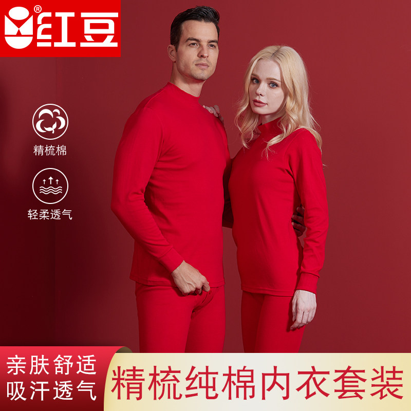 天猫红豆精梳棉纯全棉男女内衣套装白色青年低圆领秋衣秋裤保暖加大码