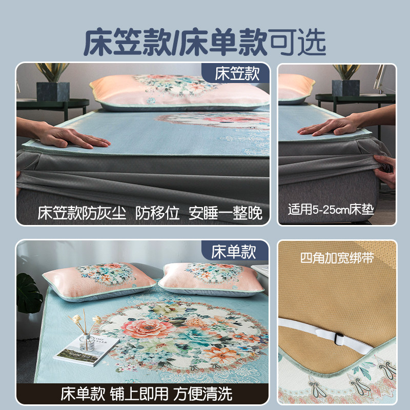 天夏季艾草冰丝凉席床笠款三件套冰藤席凉感可机洗水洗折叠空调席子