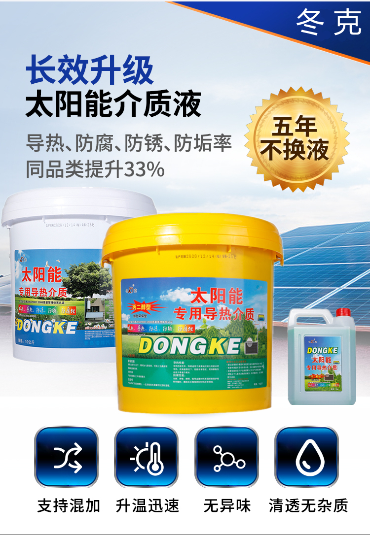 阳台壁挂平板太阳能专用导热油防冻液是一款专为太阳能热水系统及空气能热水器设计的高效传热介质。本品采用优质基础液与复合添加剂精制而成,具备优异的导热性能、防冻、防沸、防腐蚀和抗结垢特性,可在-40℃至200℃宽温范围内稳定运行,有效保护系统管路,延长设备使用寿命。适用于阳台壁挂式平板太阳能集热器与空气能热水器循环系统,兼容性强,传热效率高,确保全天候稳定供热。大桶装设计便于工程安装与维护,环保无毒,使用安全。是太阳能热水系统高效、节能、可靠运行的优选介质。
