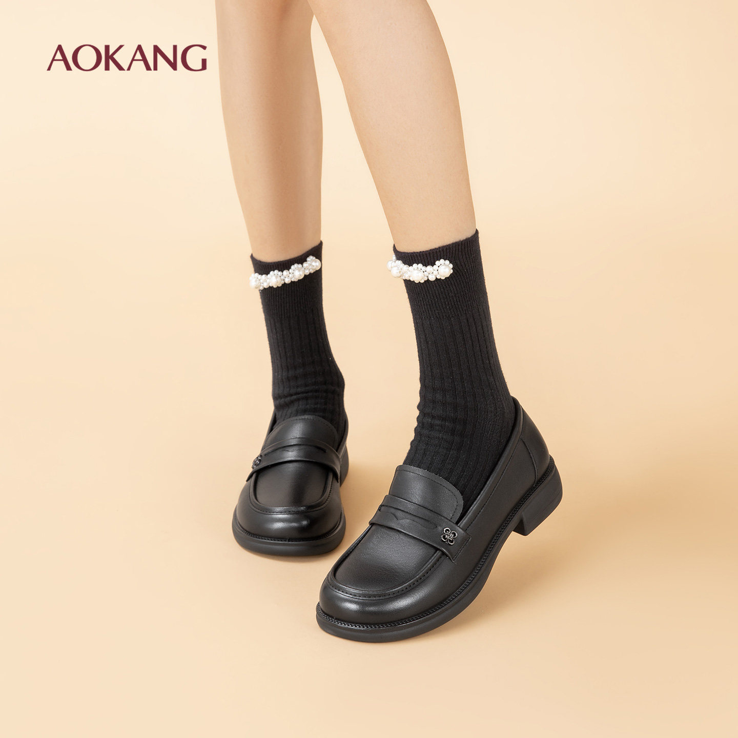 天猫奥康女鞋真皮妈妈鞋软底不累脚春季款乐福鞋中年防滑皮鞋舒适单鞋