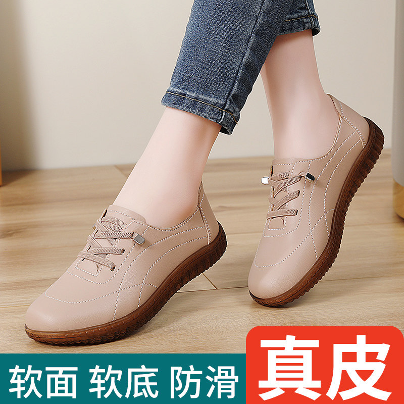 淘三只羊真皮妈妈鞋单鞋女牛筋底一脚蹬底防滑四季春秋平底小白鞋