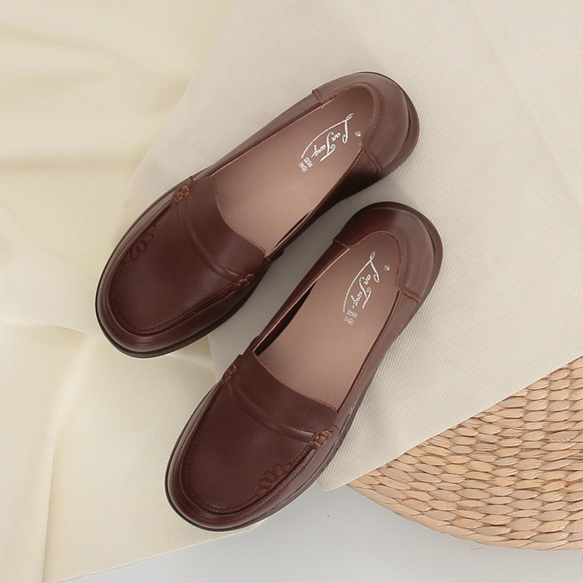 羊皮~棕色山茶花乐福鞋女2026新款通勤粗跟单鞋百搭英伦风小皮鞋