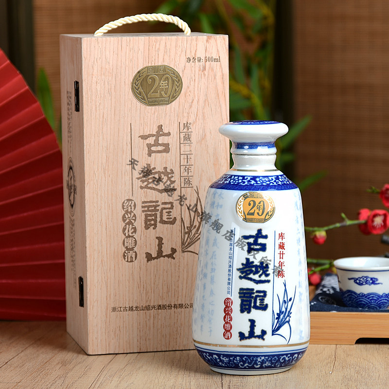 天猫古越龙山绍兴黄酒木盒库藏二十年陈半干型花雕酒500ml
