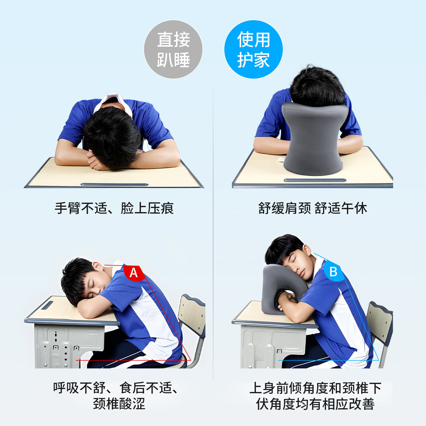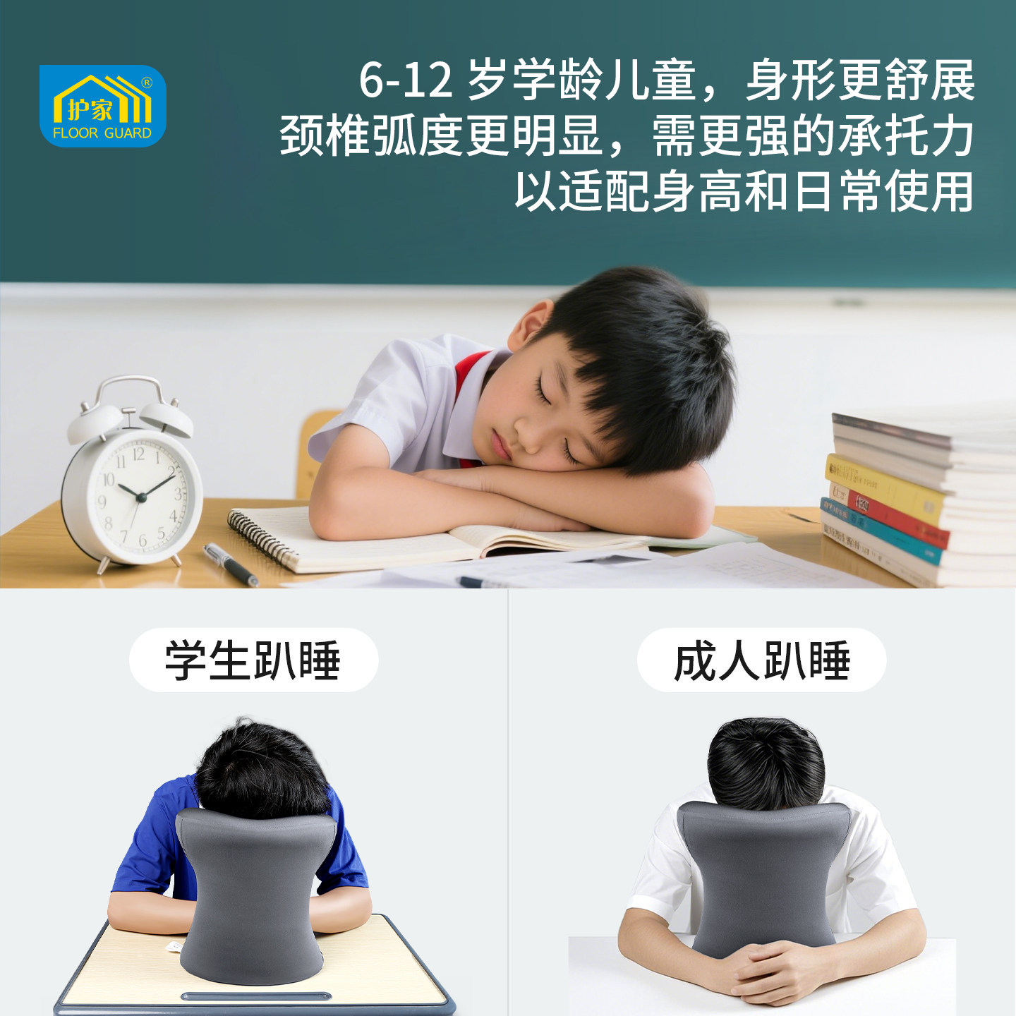 护家午睡枕是一款专为小学生、儿童乃至成人设计的午休神器,适用于学校课桌、办公室工位等多种场景。采用人体工学设计,U型或趴睡造型有效承托头部与颈部,缓解趴睡时手臂无处安放和颈椎压力,提升午休舒适度。优质慢回弹记忆棉填充,柔软透气,久压不变形;外层为亲肤可拆洗面料,清洁方便。小巧轻便,不占空间,帮助学生和上班族在有限环境中获得优质小憩,提升下午学习和工作效率。无论是课堂午休还是办公室短暂休息,护家午睡枕都是健康、实用的贴心伴侣。