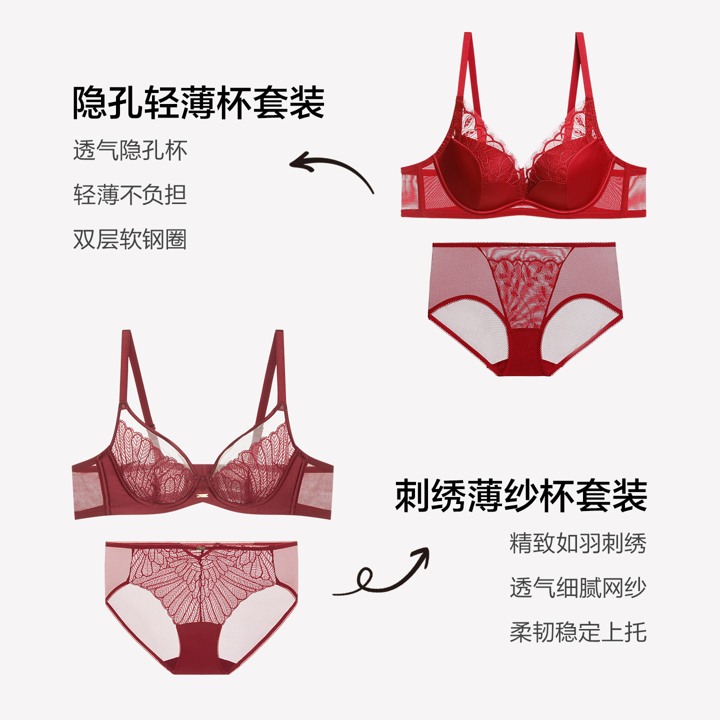【红品套装】爱慕本命年内衣女款,专为东方女性设计,融合传统喜庆元素与现代舒适科技。采用优质弹力面料,亲肤透气,薄款设计轻盈贴身,大胸显小、小胸聚拢,轻松塑造自然曼妙曲线。立体剪裁承托力强,无钢圈设计减少束缚,日常穿着更自在。配套同系列内裤,精致蕾丝点缀,提升整体美感。经典中国红寓意吉祥好运,是本命年馈赠自用佳品。无论是日常通勤还是特殊场合,都能展现优雅自信风采,兼顾舒适与美感,为爱美的你贴心守护每一天。