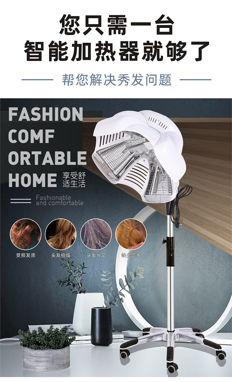 全新升级美发烘发机,集加热、染发、烫发、冷烫定型、焗油护理等多功能于一体,采用智能温控系统,精准调节温度,避免过热损伤发质。创新“太空伞”式立体热风循环设计,加速药水渗透,提升烫发与染发效率,缩短造型时间。内置负离子与水母蛋白护发技术,在加热同时释放滋养成分,锁水修护,令秀发柔顺亮泽。适用于沙龙专业操作及家庭护发,安全高效,操作简便。无论是快速定型、深层焗油,还是冷烫塑型,一台机器轻松搞定,是现代美发造型的理想之选,助您轻松打造持久亮丽的发型。