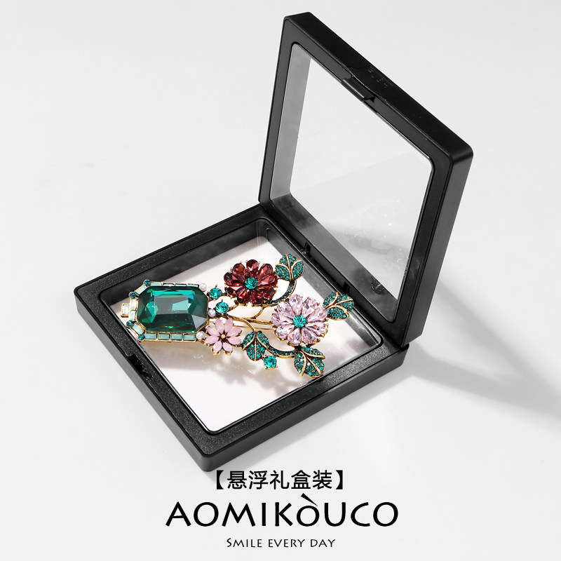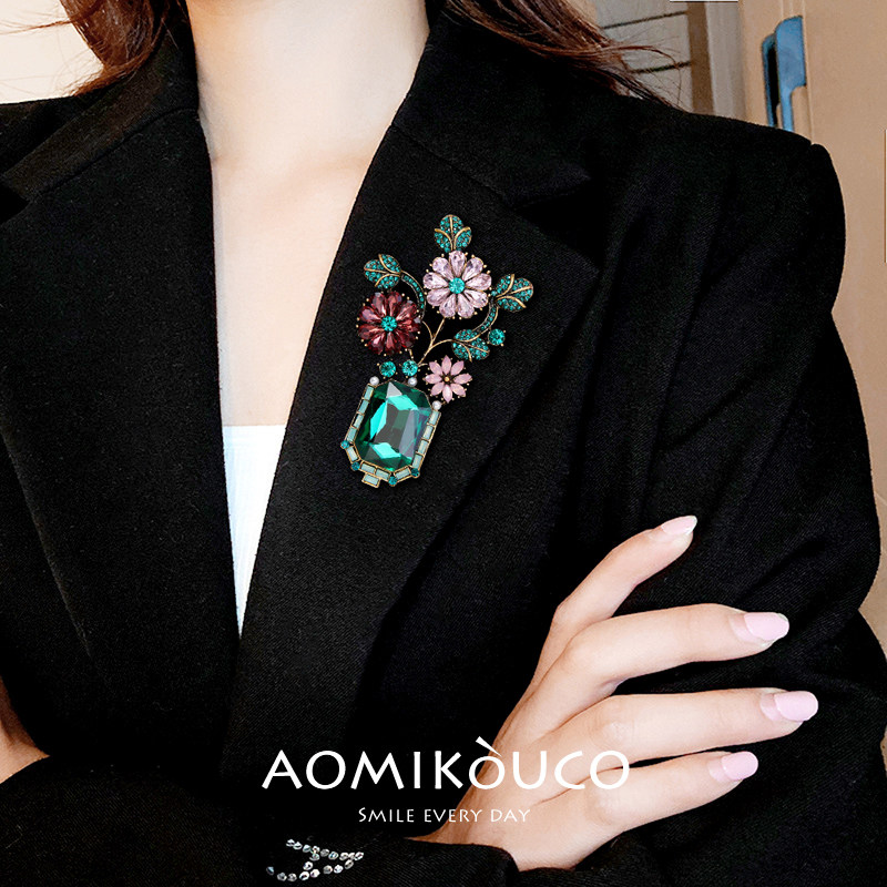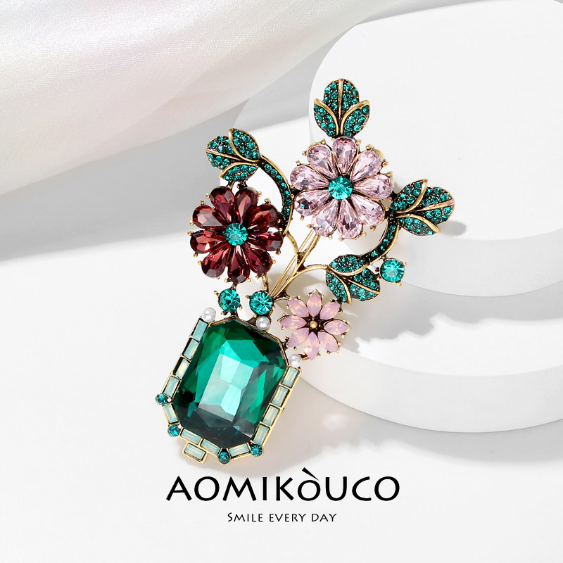 淘宝欧美复古森系绿色水晶花朵胸针高档女气质个性植物别针秋冬配饰品