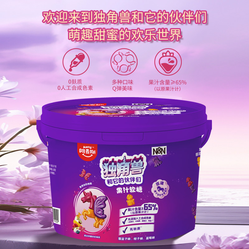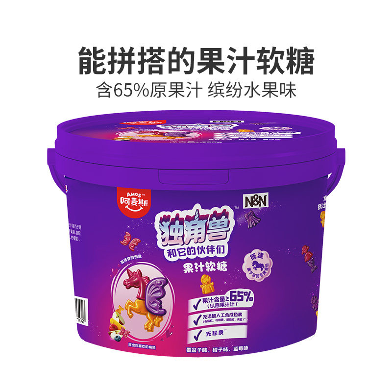 天猫阿麦斯独角兽和它的伙伴们果汁软糖宝宝桶儿童糖果休闲零食喜糖