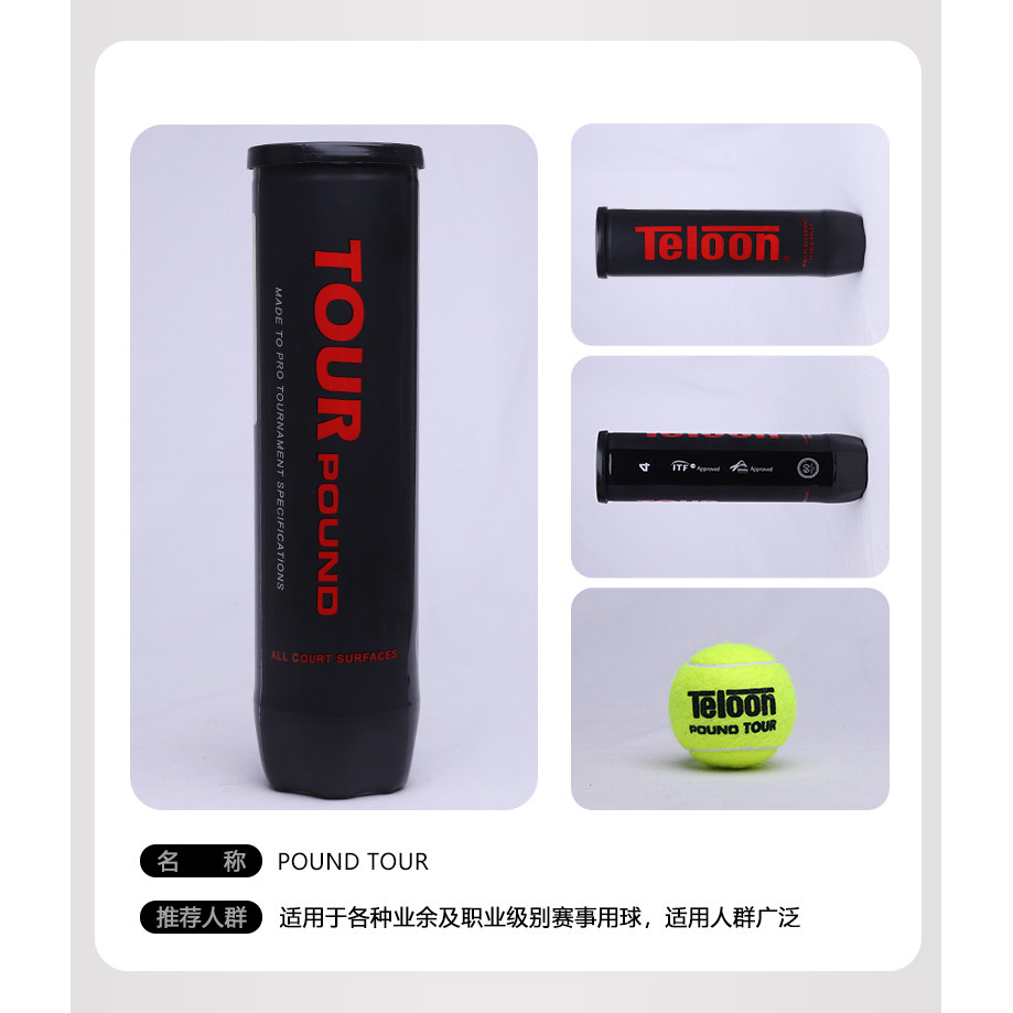 Teloon天龙网球PoundTour P4是一款专为训练与专业比赛设计的高性能网球,采用气压足、高弹耐打技术,确保击球手感稳定、回弹有力。球体结构精密,耐用性强,可承受高强度连续击打,适合各级别球员日常训练及正式比赛使用。精选优质毛毡与橡胶内胆,兼顾飞行稳定性与耐磨性,在室内外场地均表现出色。4粒装设计便于携带与备用,满足训练和比赛需求。PoundTour P4凭借卓越品质与可靠性能,成为众多网球爱好者和专业选手的理想选择,助力提升球技表现。