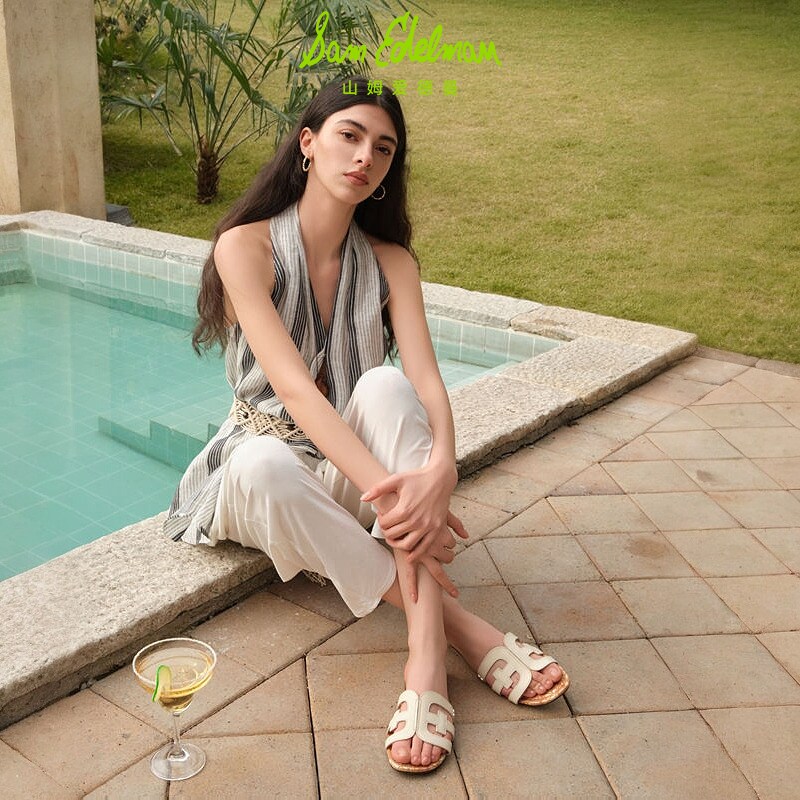 SAMEDELMAN山姆爱德曼26春夏推出的BAY系列白色粉彩风牛皮外穿一字凉拖鞋,以简约优雅的设计诠释现代女性时尚态度。精选优质牛皮材质,柔软透气,贴合脚型,兼顾舒适与质感。纯白色调融入柔和粉彩元素,清新淡雅,轻松搭配裙装或休闲裤装。一字带设计简洁大方,后跟无束缚,适合日常出行、度假或都市漫步。防滑耐磨鞋底提升行走稳定性,兼顾美观与实用。整体造型轻盈灵动,彰显低调轻奢风格,是26春夏不可或缺的百搭单品,为夏日穿搭增添一抹温柔与自在。