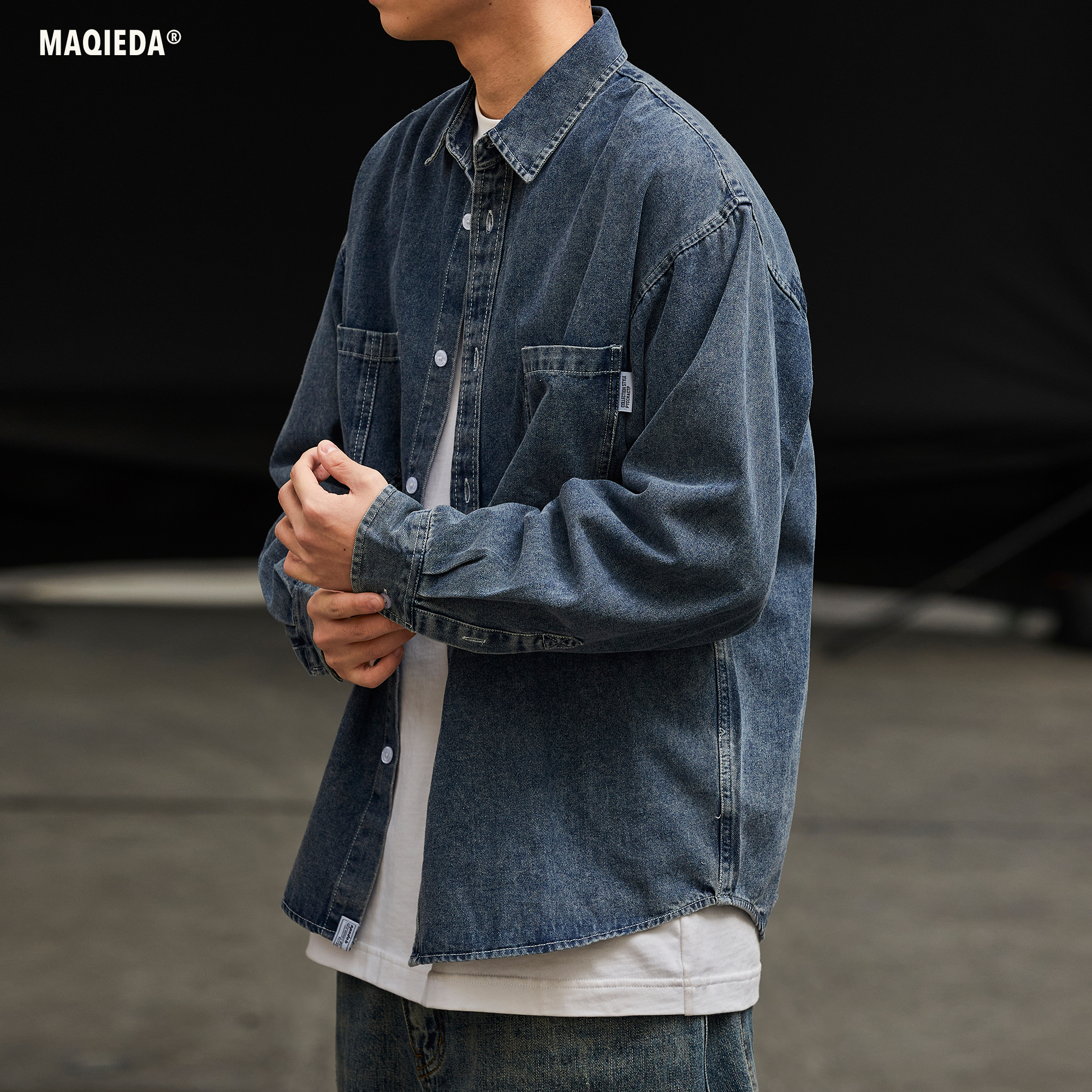 淘宝马切达秋季男士水洗牛仔衬衫日系纯色翻领衬衣男款宽松长袖潮牌