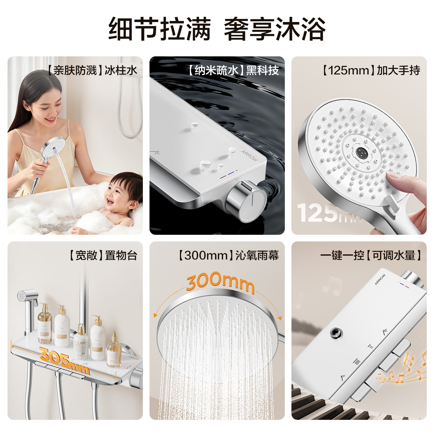 日丰奶油风白色儿童淋浴恒温花洒套装过滤极简易无顶喷淋浴器慕斯