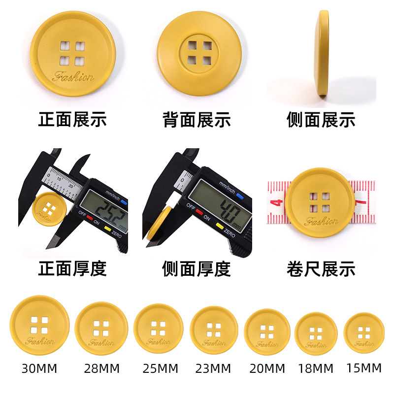 这款圆形树脂四眼纽扣专为高档毛呢大衣、风衣及西服外套设计,采用优质环保树脂材质,质地坚实、光泽温润,兼具耐用性与高级感。纽扣表面经精细抛光处理,呈现细腻质感,并推出多款彩色选择,可完美匹配不同色系面料,提升整体穿搭层次。四孔设计便于缝制,牢固稳定,适用于袖口、门襟等关键部位,亦可作为装饰性袖扣使用。无论是经典商务西装,还是时尚休闲风衣,都能为其增添一抹精致亮点。适用于定制服装、高端成衣及手工改造,是追求品质与细节的理想选择。