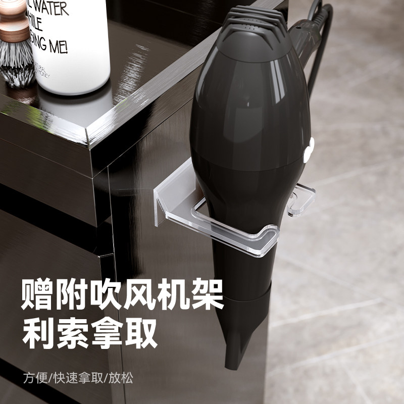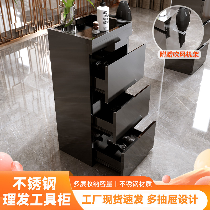理发店工具柜是美发沙龙中不可或缺的储物设备,通常采用优质不锈钢材质制成,防锈耐用、易于清洁。其设计兼顾实用性与美观性,配备多层抽屉、开放式隔层及可移动推车结构,方便存放剪刀、梳子、电推剪、吹风机、染发工具等常用美发器具。部分款式还配有锁扣功能,保障工具安全。美发店工具车柜子兼具移动性与稳定性,底部带静音万向轮,可灵活穿梭于不同工位之间,提升工作效率。整体结构紧凑合理,节省空间,是现代发廊专业、整洁工作环境的重要支撑,广泛应用于理发店、造型工作室及高端沙龙。