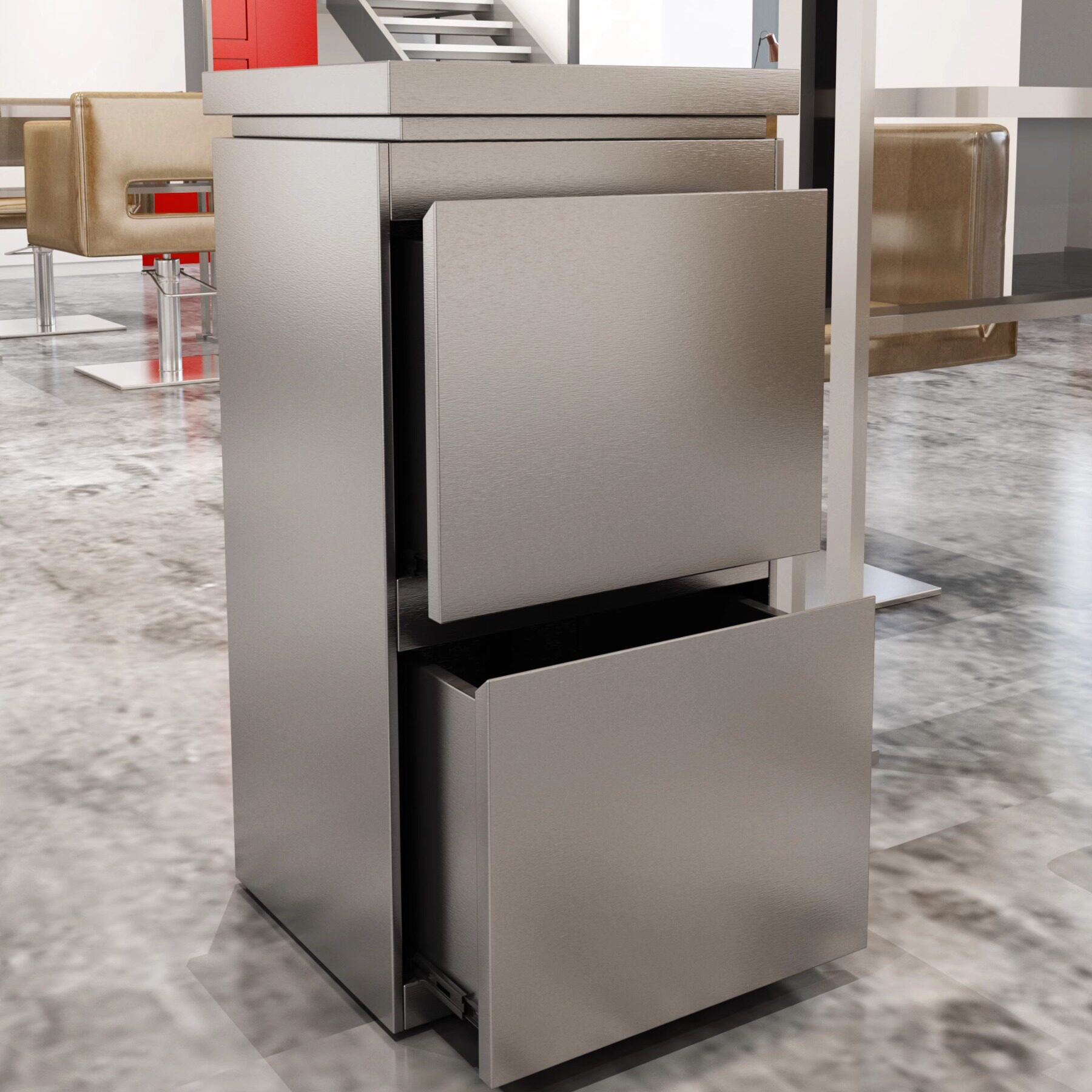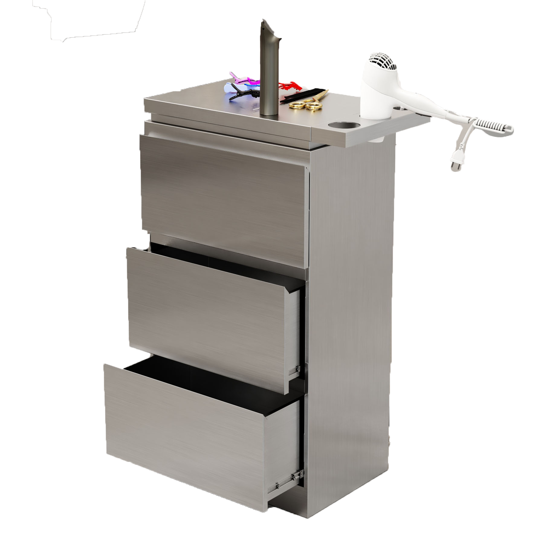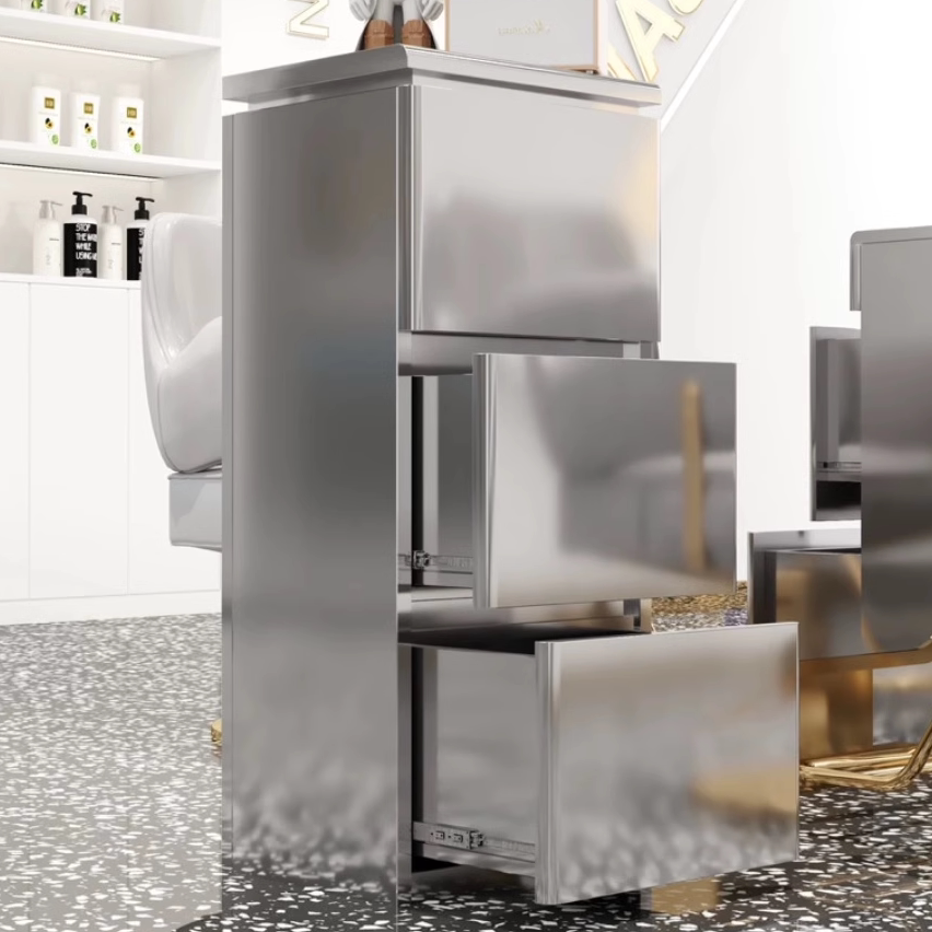 这款专为发廊设计的不锈钢双面美发工具柜,集实用性与耐用性于一体。采用优质304不锈钢材质,防锈耐腐蚀,承重力强,适合频繁使用的专业环境。双面开放式设计,空间布局合理,可分类收纳剪刀、梳子、染发刷、围布等美发工具,取用便捷高效。底部配备静音万向轮,移动灵活,360度旋转不卡顿,轻松穿梭于不同工位。整体结构稳固,表面光滑易清洁,符合卫生标准。无论是染发、剪发还是造型,这款多功能推车柜都能为发型师提供整洁有序的工作台,提升服务效率与专业形象,是现代美发沙龙的理想之选。