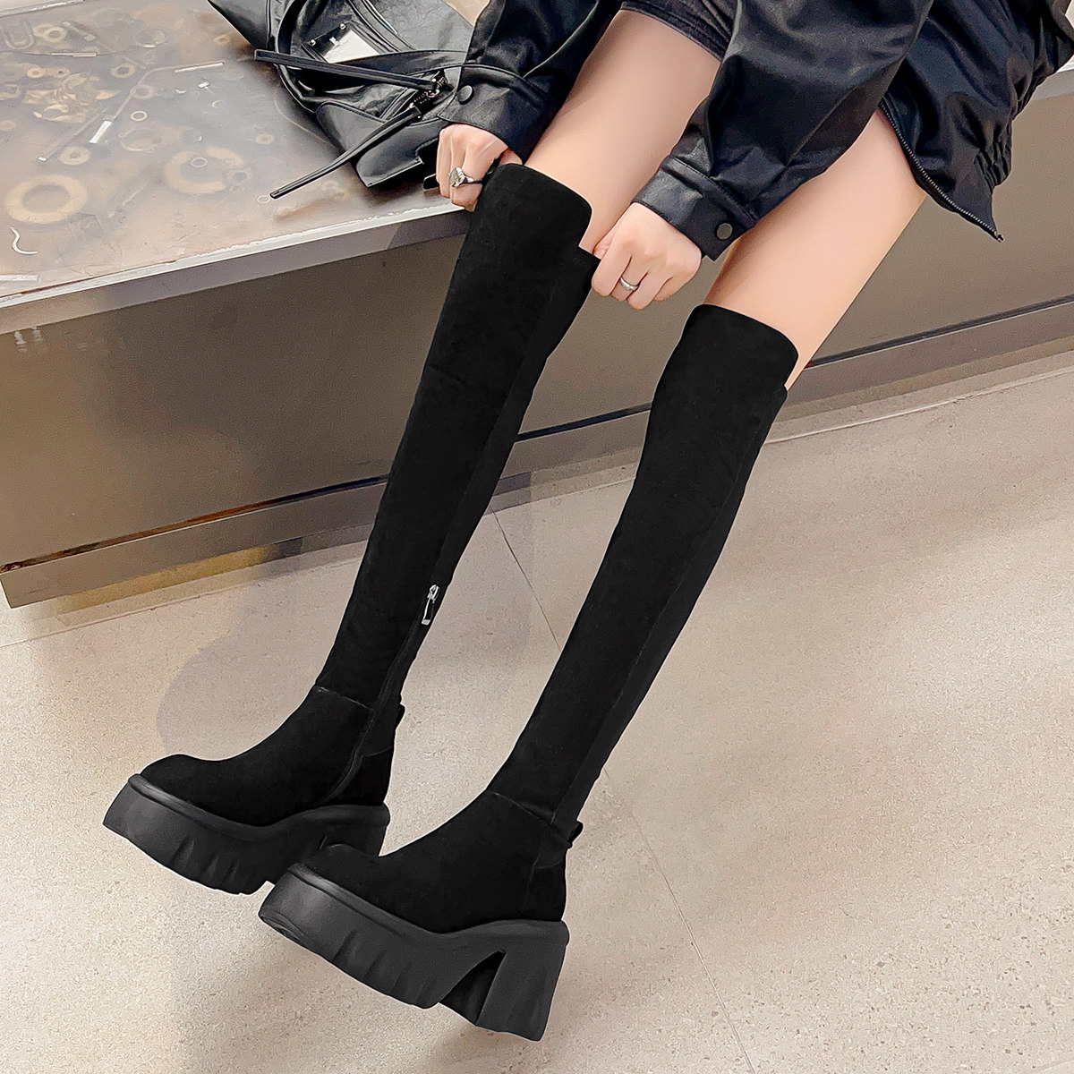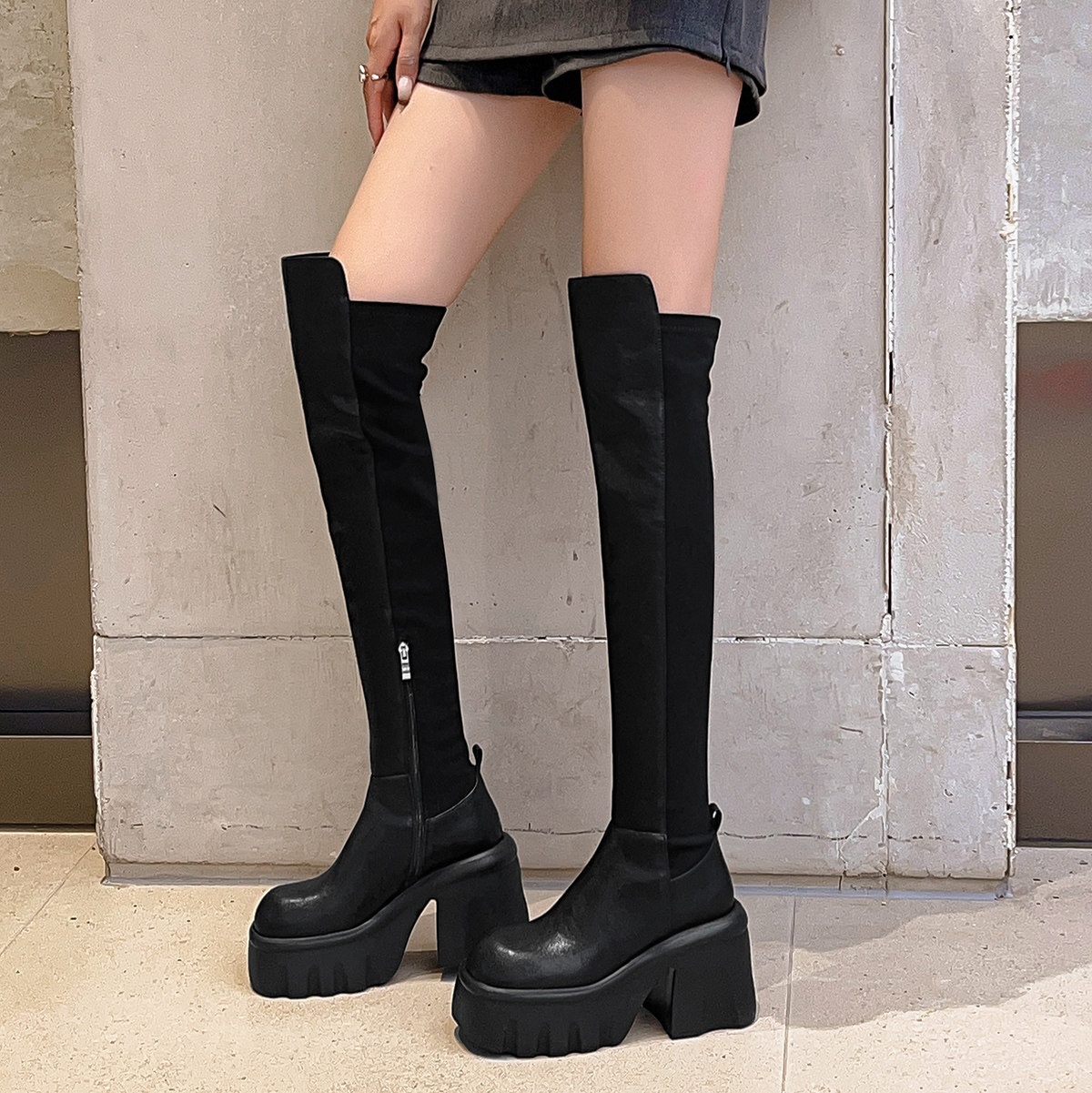 淘宝高筒弹力靴厚底女鞋粗高跟靴子长筒马丁靴瘦腿机车靴松糕跟骑士靴