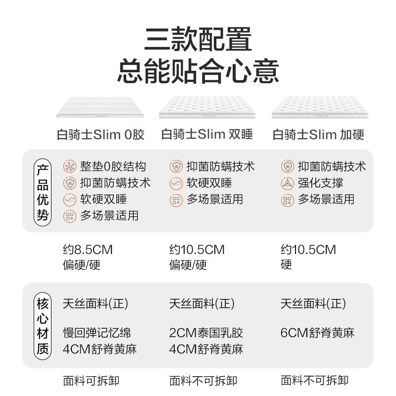 【白骑士slim】喜临门儿童乳胶黄麻记忆棉0胶偏硬新榻榻米薄床垫,专为儿童健康睡眠设计。采用天然乳胶与透气黄麻层结合,搭配高密度记忆棉,提供适中偏硬支撑,呵护孩子脊椎发育。0胶水工艺确保环保无异味,安全亲肤,守护呼吸健康。薄款设计适配榻榻米、高低床等多种床型,防滑底面稳固不易移位。整体轻盈易搬运,透气防潮,四季干爽舒适。喜临门匠心品质,为儿童打造科学护脊、安心睡眠的成长伴侣,让每一晚都安稳香甜。